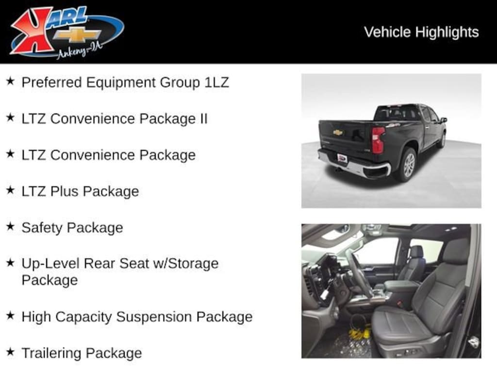 Factory MSRP: $66,200 $6,870 off MSRP! 10-Speed Automatic, 4WD, Black Leather, 10-Way Power Driver Seat w/Lumbar, 10-Way Power Passenger Seat Adjuster w/Lumbar, 12.3 Multicolor Reconfigurable Digital Display, 120-Volt Bed Mounted Power Outlet, 120-Volt Interior Power Outlet, 2 USB Data Ports, 2nd Row Heated Outboard Seats, 7 Speakers, Adaptive Cruise Control, Air Conditioning, AM/FM radio: SiriusXM with 360L, Auto-Dimming Inside Rear-View Mirror, Auto-Locking Rear Differential, Automatic temperature control, Bluetooth® For Phone, Brake assist, Chrome Mirror Caps, Color-Keyed Carpeting Floor Covering, Deep-Tinted Glass, Driver Memory, Dual front impact airbags, Dual front side impact airbags, Dual Rear USB Ports (Charge Only), Electric Rear-Window Defogger, Electronic Cruise Control, Electronic Stability Control, EZ Lift Power Lock & Release Tailgate, Floor Mounted Center Console, Forward Collision Alert, Front anti-roll bar, Front Bucket Seats, Front Center Armrest, Front Frame-Mounted Black Recovery Hooks, Front LED Fog Lamps, Front License Plate Kit, Front Pedestrian Braking, Front Rain-Sensing Wipers, Front Rubberized Vinyl Floor Mats, Front wheel independent suspension, HD Surround Vision, Heated door mirrors, Heated Driver & Front Outboard Passenger Seats, Heated front seats, Heated Steering Wheel, High Capacity Suspension Package, Hitch Guidance, Hitch Guidance w/Hitch View, In-Vehicle Trailering System App, Integrated Trailer Brake Controller, IntelliBeam Automatic High Beam On/Off, Keyless Open & Start, LED Cargo Area Lighting, LTZ Convenience Package, LTZ Convenience Package II, LTZ Plus Package, Memory seat, Multi-Flex Tailgate, Occupant sensing airbag, OnStar Services Capable, Outside Heated Power-Adjustable Mirrors, Outside temperature display, Overhead console, Perforated Leather-Appointed Front Seat Trim, Perimeter Lighting, Power Front Passenger Windows w/Express Up/Down, Power Front Windows w/Driver Express Up/Down, Power Rear Windows w/Express Down, Power Sliding Rear Window w/Rear Defogger, Power Sunroof, Power Tailgate, Power Tilt & Telescoping Steering Column, Power windows, Preferred Equipment Group 1LZ, Premium Bose 7-Speaker Sound System, Rain sensing wipers, Rear Cross Traffic Braking, Rear Pedestrian Alert, Rear Rubberized-Vinyl Floor Mats, Rear Wheelhouse Liners, Remote keyless entry, Remote Vehicle Starter System, Safety Alert Seat, Safety Package, SiriusXM w/360L Trial Subscription, Standard Tailgate, Steering Wheel Audio Controls, Teen Driver, Telescoping steering wheel, Theft Deterrent System (Unauthorized Entry), Tire Pressure Monitoring System, Trailer Camera Provisions, Trailer Side Blind Zone Alert, Trailering Package, Ultrasonic Front & Rear Park Assist, Universal Home Remote, Up-Level Rear Seat w/Storage Package, Variably intermittent wipers, Ventilated Driver & Front Passenger Seats, Wi-Fi Hot Spot Capable, Wireless Charging, Wrapped Steering Wheel.New Price!Black 2026 Chevrolet Silverado 1500 LTZ 4D Crew Cab EcoTec3 5.3L V8 10-Speed Automatic 4WD Price includes: $1000 - GM Bonus Cash. Exp. 11/03/2025 $2000 - Chevrolet Consumer Cash Program. Exp. 11/03/2025