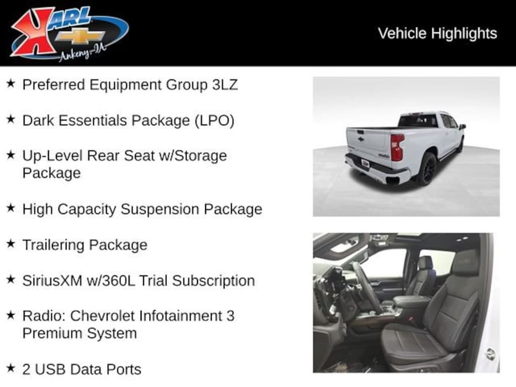 The 2026 Chevrolet Silverado 1500 High Country In-Transit is a remarkable pickup that combines power, capability, and refined luxury. With its impressive EcoTec3 6.2L V8 engine, this Silverado delivers 420 horsepower and 460 lb-ft of torque, providing the muscle you need for your toughest jobs and adventures.- 6.2L V8 (EcoTec3) engine with Dynamic Fuel Management- Dark Essentials Package- High Capacity Suspension Package- Preferred Equipment Group 3LZ- Trailering Package- Up-Level Rear Seat with Storage PackageThe Silverado's premium features elevate your driving experience, including the Chevrolet Infotainment 3 Premium system with a 12.3-inch reconfigurable digital display, a premium Bose 7-speaker sound system, and a host of advanced safety and connectivity technologies. The power-sliding rear window, heated and ventilated front seats, and heated rear seats ensure your comfort in any weather.Designed for both work and play, the Silverado 1500 High Country offers exceptional capability with its 4WD system, integrated trailer brake controller, and Hitch Guidance with Hitch View. The Chevytec spray-on bedliner and multi-flex tailgate provide versatile cargo management, while the 22-inch high-gloss black wheels or 22-inch transit steel wheels give this truck a bold, distinguished appearance.Safety is paramount, and the Silverado 1500 High Country delivers with features like Adaptive Cruise Control, Rear Cross Traffic Braking, and Rear Pedestrian Alert. The Ultrasonic Front and Rear Park Assist and HD Surround Vision cameras help you navigate with confidence, whether you're maneuvering in tight spaces or towing a heavy load.Experience the perfect blend of power, capability, and refinement in the 2026 Chevrolet Silverado 1500 High Country. This vehicle is the ultimate choice for those who demand the best from their pickup truck.At Karl Chevrolet, we want to help you find the best new or used car in Ankeny that suits your needs. When you buy a new car at Karl Chevrolet, you know you're finding a vehicle you can rely on. We have a great selection of Platinum Quality Pre-Owned Vehicles. We also pride ourselves in creating a friendly atmosphere and a reliable Dealership that you can trust. Call us and our experts will be glad to help you! (515) 299-4300. *Equipment and options are generated by a 3rd party vendor, exact vehicle options may vary. Please see a salesperson for complete details and vehicle information. Price includes: $2500 - Chevrolet Consumer Cash Program. Exp. 03/31/2026 $750 - Chevrolet Bonus Cash. Exp. 03/31/2026