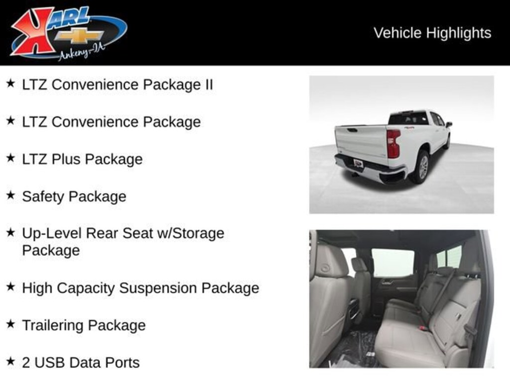 Factory MSRP: $65,490 $5,750 off MSRP! Priced below KBB Fair Purchase Price! 10-Speed Automatic, 4WD, Gideon/Very Dk Atmosphere Leather, 12.3 Multicolor Reconfigurable Digital Display, 2 USB Data Ports, 2nd Row Heated Outboard Seats, Adaptive Cruise Control, Air Conditioning, Apple CarPlay/Android Auto, Auto-Dimming Inside Rear-View Mirror, Chevytec Spray-On Black Bedliner, Dual Rear USB Ports (Charge Only), Electric Rear-Window Defogger, Floor Mounted Center Console, Forward Collision Alert, Front Pedestrian Braking, Front reading lights, HD Surround Vision, Heated door mirrors, High Capacity Suspension Package, Hitch Guidance, LED Cargo Area Lighting, LTZ Convenience Package, LTZ Convenience Package II, LTZ Plus Package, Perimeter Lighting, Power driver seat, Power Front Windows w/Driver Express Up/Down, Power Sliding Rear Window w/Rear Defogger, Power steering, Power Tailgate, Power Tilt & Telescoping Steering Column, Power windows, Premium audio system: Chevrolet Infotainment 3 Premium, Premium Bose 7-Speaker Sound System, Rear Cross Traffic Braking, Rear Pedestrian Alert, Rear Wheelhouse Liners, Remote Vehicle Starter System, Safety Alert Seat, Safety Package, Standard Tailgate, Tire Pressure Monitoring System, Trailer Camera Provisions, Trailer Side Blind Zone Alert, Trailering Package, Ultrasonic Front & Rear Park Assist, Universal Home Remote, Up-Level Rear Seat w/Storage Package, Ventilated Driver & Front Passenger Seats, Wheels: 20 x 9 Sterling Silver Painted Aluminum, Wireless Charging.