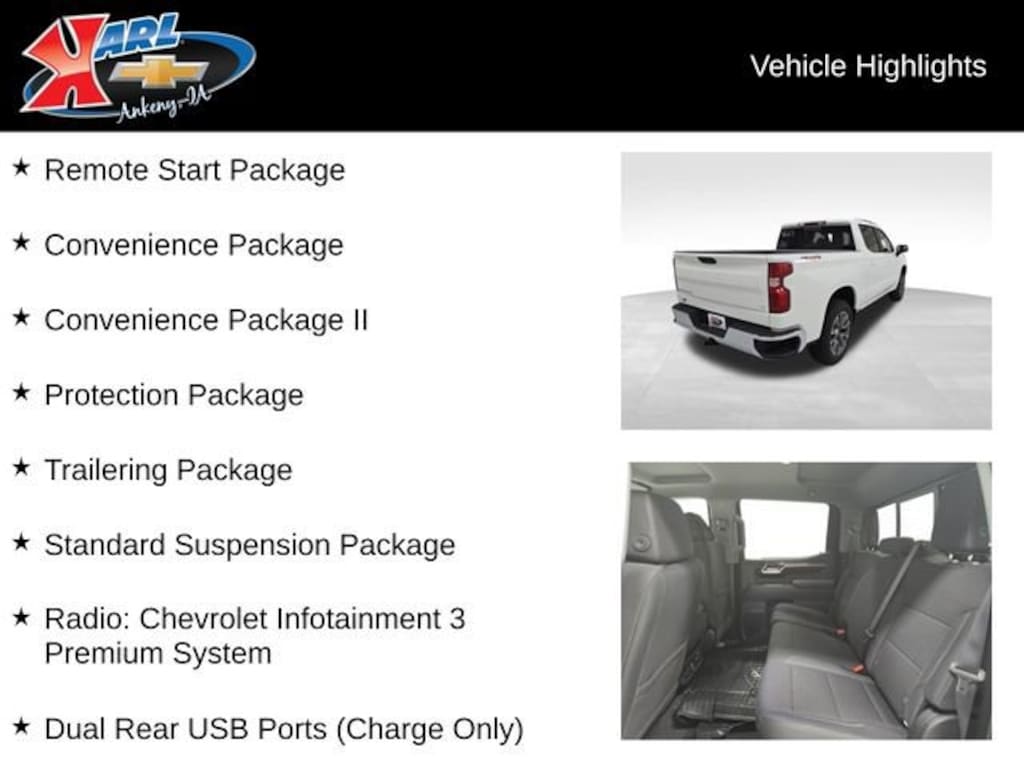 Factory MSRP: $60,955 $6,715 off MSRP! 10-Speed Automatic, 4WD, Black Cloth, 10-Way Power Driver Seat w/Lumbar, 12.3 Multicolor Reconfigurable Digital Display, 120-Volt Bed Mounted Power Outlet, 120-Volt Interior Power Outlet, 40/20/40 Front Split-Bench Seat, 6-Speaker Audio System, All-Star Edition, All-Weather Floor Liner (LPO), Apple CarPlay/Android Auto, Bumpers: chrome, Chevytec Spray-On Black Bedliner, Chrome Mirror Caps, Convenience Package, Convenience Package II, Dual Rear USB Ports (Charge Only), Dual-Zone Automatic Climate Control, Electric Rear-Window Defogger, Heated door mirrors, Heated Driver & Front Outboard Passenger Seats, Heated Power-Adjustable Outside Mirrors, Heated Steering Wheel, Hitch Guidance, Hitch Guidance w/Hitch View, In-Vehicle Trailering System App, IntelliBeam Automatic High Beam On/Off, Keyless Open & Start, LED Cargo Area Lighting, Manual Tilt/Telescoping Steering Column, Power Sliding Rear Window w/Rear Defogger, Premium audio system: Chevrolet Infotainment 3 Premium, Protection Package, Radio: Chevrolet Infotainment 3 Premium System, Rear 60/40 Folding Bench Seat (Folds Up), Rear Wheelhouse Liners, Remote Start Package, Remote Vehicle Starter System, Split folding rear seat, Standard Suspension Package, Theft Deterrent System (Unauthorized Entry), Trailering Package, Universal Home Remote, Wheels: 20 x 9 Painted Aluminum, Wrapped Steering Wheel.