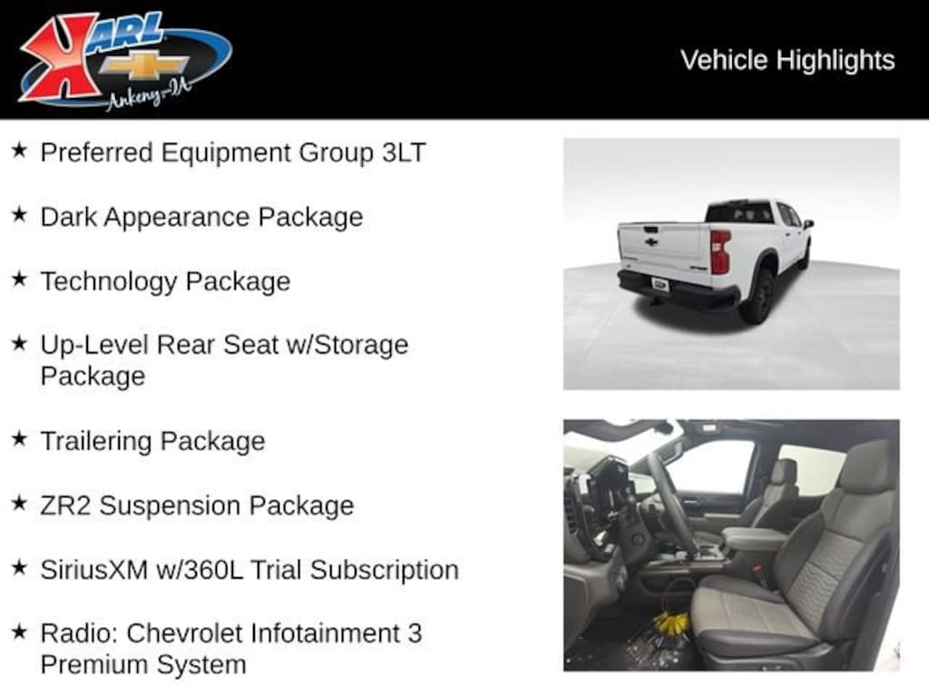 Factory MSRP: $75,490 $6,744 off MSRP! 10-Speed Automatic, 4WD, Jet Black/Graystone Leather, 10-Way Power Driver Seat w/Lumbar, 10-Way Power Passenger Seat Adjuster w/Lumbar, 12.3 Multicolor Reconfigurable Digital Display, 120-Volt Bed Mounted Power Outlet, 120-Volt Interior Power Outlet, 15 Diagonal Multicolor Head-Up Display, 2 USB Data Ports, 2nd Row Heated Outboard Seats, Adaptive Cruise Control, All-Weather Floor Liner (LPO), Apple CarPlay/Android Auto, Bed View Camera, Bluetooth® For Phone, Chevytec Spray-On Black Bedliner, Color-Keyed Carpeting Floor Covering, Dark Appearance Package, Deep-Tinted Glass, Driver Memory, Dual Rear USB Ports (Charge Only), Electric Rear-Window Defogger, Electronic Transmission Range Selector Shifter, EZ Lift Power Lock & Release Tailgate, Floor Mounted Center Console, Front Bucket Seats, Front Center Armrest, Front Frame-Mounted Black Recovery Hooks, Front LED Fog Lamps, Front License Plate Kit, Front Rain-Sensing Wipers, HD Surround Vision, Heated door mirrors, Heated Driver & Front Outboard Passenger Seats, Heated rear seats, Heated Steering Wheel, Heavy-Duty Air Filter, High Gloss Black Mirror Caps, Hill Descent Control, Hitch Guidance, Hitch Guidance w/Hitch View, In-Vehicle Trailering System App, Integrated Trailer Brake Controller, IntelliBeam Automatic High Beam On/Off, Keyless Open & Start, LED Cargo Area Lighting, Multi-Flex Tailgate, OnStar Services Capable, Outside Heated Power-Adjustable Mirrors, Perforated Leather Seat Trim, Performance Red Recovery Hooks, Perimeter Lighting, Power Front Passenger Windows w/Express Up/Down, Power Front Windows w/Driver Express Up/Down, Power passenger seat, Power Rear Windows w/Express Down, Power Sliding Rear Window w/Rear Defogger, Power Sunroof, Power Tilt & Telescoping Steering Column, Preferred Equipment Group 3LT, Premium audio system: Chevrolet Infotainment 3 Premium, Premium Bose 7-Speaker Sound System, Radio: Chevrolet Infotainment 3 Premium System, Rear Camera Mirror, Rear Cross Traffic Braking, Rear Pedestrian Alert, Rear Wheelhouse Liners, Remote Vehicle Starter System, Safety Alert Seat, SiriusXM w/360L Trial Subscription, Split folding rear seat, Steering Wheel Audio Controls, Technology Package, Teen Driver, Theft Deterrent System (Unauthorized Entry), Tire Pressure Monitoring System, Trailer Camera Provisions, Trailer Side Blind Zone Alert, Trailering Package, Ultrasonic Front & Rear Park Assist, Universal Home Remote, Up-Level Rear Seat w/Storage Package, Ventilated Driver & Front Passenger Seats, Wheels: 18 x 8.5 Gloss Black, Wi-Fi Hot Spot Capable, Wrapped Steering Wheel, ZR2 Suspension Package.
