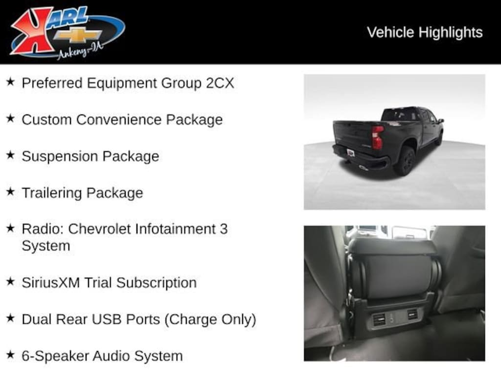 Factory MSRP: $58,670 $4,541 off MSRP! 10-Speed Automatic, 4WD, Black Cloth, 10-Way Power Driver Seat w/Lumbar, 120-Volt Bed Mounted Power Outlet, 120-Volt Interior Power Outlet, 3.5 Monochromatic Display Driver Info Center, 40/20/40 Front Split-Bench Seat, 6-Speaker Audio System, Apple CarPlay/Android Auto, Auto-Locking Rear Differential, Bluetooth® For Phone, Chevytec Spray-On Black Bedliner, Color-Keyed Carpeting Floor Covering, Custom Convenience Package, Deep-Tinted Glass, Dual Exhaust w/Polished Outlets, Dual Rear USB Ports (Charge Only), Electric Rear-Window Defogger, Electronic Cruise Control, EZ Lift Power Lock & Release Tailgate, Front License Plate Kit, Front Rubberized Vinyl Floor Mats, HD Rear Vision Camera, Heated door mirrors, Heavy-Duty Air Filter, Hill Descent Control, Hitch Guidance, IntelliBeam Automatic High Beam On/Off, LED Cargo Area Lighting, Manual Tilt Wheel Steering Column, OnStar Services Capable, Performance Red Recovery Hooks, Power Front Windows w/Driver Express Up/Down, Power Front Windows w/Passenger Express Down, Power Rear Windows w/Express Down, Preferred Equipment Group 2CX, Radio: Chevrolet Infotainment 3 System, Rear 60/40 Folding Bench Seat (Folds Up), Rear Rubberized-Vinyl Floor Mats, Remote Keyless Entry, Remote Vehicle Starter System, SiriusXM Trial Subscription, Split folding rear seat, Standard Tailgate, Suspension Package, Teen Driver, Theft Deterrent System (Unauthorized Entry), Tire Pressure Monitoring System, Trailering Package, Wheels: 18 x 8.5 Black Painted Aluminum, Wi-Fi Hot Spot Capable.