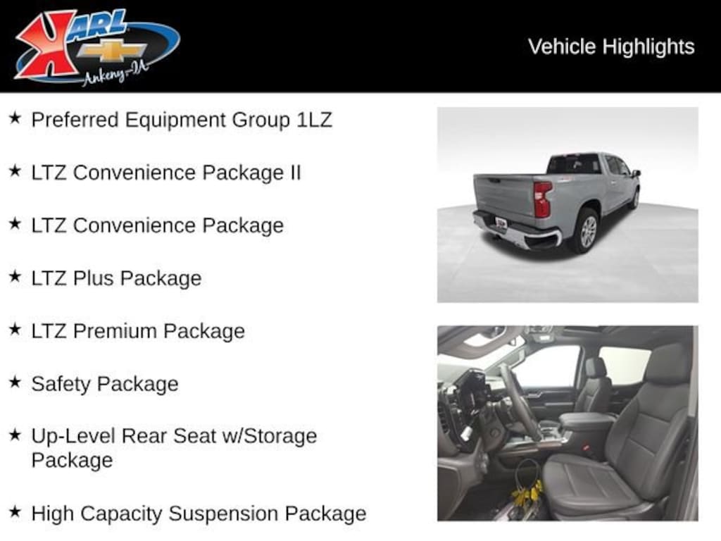 Factory MSRP: $66,980 $5,429 off MSRP! 10-Speed Automatic, 4WD, Black Leather, 10-Way Power Driver Seat w/Lumbar, 10-Way Power Passenger Seat Adjuster w/Lumbar, 12.3 Multicolor Reconfigurable Digital Display, 120-Volt Bed Mounted Power Outlet, 120-Volt Interior Power Outlet, 2 USB Data Ports, 2nd Row Heated Outboard Seats, Adaptive Cruise Control, Apple CarPlay/Android Auto, Auto-Dimming Inside Rear-View Mirror, Auto-Locking Rear Differential, Bluetooth® For Phone, Bumpers: chrome, Chevytec Spray-On Black Bedliner, Chrome Mirror Caps, Color-Keyed Carpeting Floor Covering, Deep-Tinted Glass, Driver Memory, Dual Exhaust w/Polished Outlets, Dual Rear USB Ports (Charge Only), Electric Rear-Window Defogger, Electronic Cruise Control, Electronic Transmission Range Selector Shifter, Floor Mounted Center Console, Front Bucket Seats, Front Center Armrest, Front Frame-Mounted Black Recovery Hooks, Front LED Fog Lamps, Front License Plate Kit, Front Rain-Sensing Wipers, Front Rubberized Vinyl Floor Mats, HD Surround Vision, Heated door mirrors, Heated Driver & Front Outboard Passenger Seats, Heated front seats, Heated Steering Wheel, High Capacity Suspension Package, Hitch Guidance, Hitch Guidance w/Hitch View, In-Vehicle Trailering System App, Integrated Trailer Brake Controller, IntelliBeam Automatic High Beam On/Off, Keyless Open & Start, LED Cargo Area Lighting, LTZ Convenience Package, LTZ Convenience Package II, LTZ Plus Package, LTZ Premium Package, OnStar Services Capable, Outside Heated Power-Adjustable Mirrors, Perforated Leather-Appointed Front Seat Trim, Perimeter Lighting, Power Front Passenger Windows w/Express Up/Down, Power Front Windows w/Driver Express Up/Down, Power passenger seat, Power Rear Windows w/Express Down, Power Sliding Rear Window w/Rear Defogger, Power Sunroof, Power Tailgate, Power Tilt & Telescoping Steering Column, Preferred Equipment Group 1LZ, Premium audio system: Chevrolet Infotainment 3 Premium, Premium Bose 7-Speaker Sound System, Radio: Chevrolet Infotainment 3 Premium System, Rear Cross Traffic Braking, Rear Pedestrian Alert, Rear Rubberized-Vinyl Floor Mats, Rear Wheelhouse Liners, Remote Vehicle Starter System, Safety Alert Seat, Safety Package, SiriusXM w/360L Trial Subscription, Split folding rear seat, Standard Tailgate, Steering Wheel Audio Controls, Teen Driver, Theft Deterrent System (Unauthorized Entry), Tire Pressure Monitoring System, Trailer Camera Provisions, Trailer Side Blind Zone Alert, Trailering Package, Ultrasonic Front & Rear Park Assist, Universal Home Remote, Up-Level Rear Seat w/Storage Package, Ventilated Driver & Front Passenger Seats, Ventilated front seats, Wheels: 20 x 9 Sterling Silver Painted Aluminum, Wi-Fi Hot Spot Capable, Wireless Charging, Wrapped Steering Wheel.