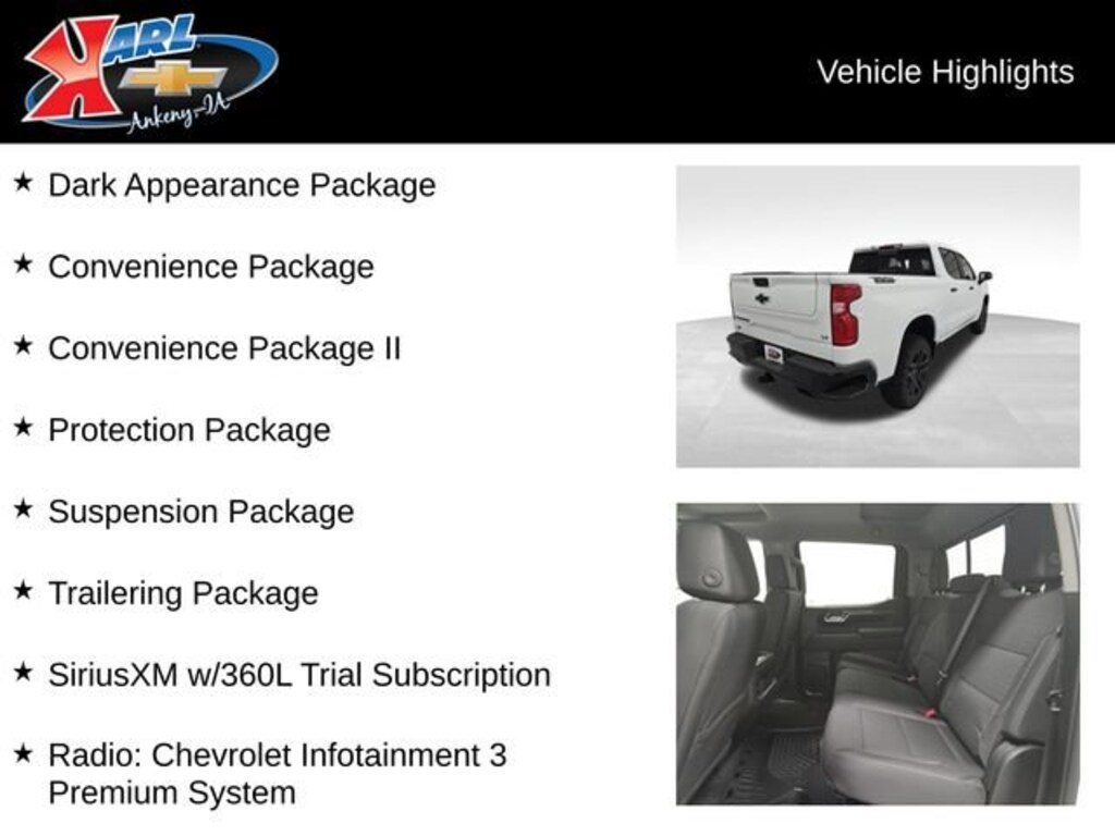 Factory MSRP: $68,005 $5,250 off MSRP! 10-Speed Automatic, 4WD, Black Cloth, 10-Way Power Driver Seat w/Lumbar, 12.3 Multicolor Reconfigurable Digital Display, 120-Volt Bed Mounted Power Outlet, 120-Volt Interior Power Outlet, 2 USB Data Ports, 6-Speaker Audio System, Air Conditioning, Automatic temperature control, Black Chrome Exhaust Tip (LPO), Chevytec Spray-On Black Bedliner, Cloth Seat Trim, Color-Keyed Carpeting Floor Covering, Convenience Package, Convenience Package II, Dark Appearance Package, Dual front impact airbags, Dual front side impact airbags, Dual Rear USB Ports (Charge Only), Dual-Zone Automatic Climate Control, Electric Rear-Window Defogger, Electronic Cruise Control, Electronic Stability Control, Electronic Transmission Range Selector Shifter, Emergency communication system: OnStar, EZ Lift Power Lock & Release Tailgate, Floor Mounted Center Console, Forward Collision Alert, Front Bucket Seats, Front Center Armrest w/Storage, Front dual zone A/C, Front Frame-Mounted Black Recovery Hooks, Front Pedestrian Braking, Front reading lights, Heated Driver & Front Outboard Passenger Seats, Heated front seats, Heated Power-Adjustable Outside Mirrors, Heavy-Duty Air Filter, High Gloss Black Mirror Caps, Hill Descent Control, Hitch Guidance, Hitch Guidance w/Hitch View, In-Vehicle Trailering System App, Inside Rear-View Mirror w/Tilt, Integrated Trailer Brake Controller, Keyless Open & Start, Lane Keep Assist w/Lane Departure Warning, LED Cargo Area Lighting, Manual Tilt/Telescoping Steering Column, OnStar Services Capable, Outside temperature display, Passenger vanity mirror, Power Front Windows w/Driver Express Up/Down, Power Front Windows w/Passenger Express Down, Power Rear Windows w/Express Down, Power Sliding Rear Window w/Rear Defogger, Power windows, Premium Bose 7-Speaker Sound System, Protection Package, Radio: Chevrolet Infotainment 3 Premium System, Rear 60/40 Folding Bench Seat (Folds Up), Rear Wheelhouse Liners, Rear window defroster, Remote Vehicle Starter System, Single Outlet Exhaust, SiriusXM w/360L Trial Subscription, Split folding rear seat, Suspension Package, Teen Driver, Telescoping steering wheel, Theft Deterrent System (Unauthorized Entry), Trailering Package, Universal Home Remote, Wheels: 20 x 9 High Gloss Black Painted Alum, Wi-Fi Hot Spot Capable, Wireless Charging, Wrapped Steering Wheel.