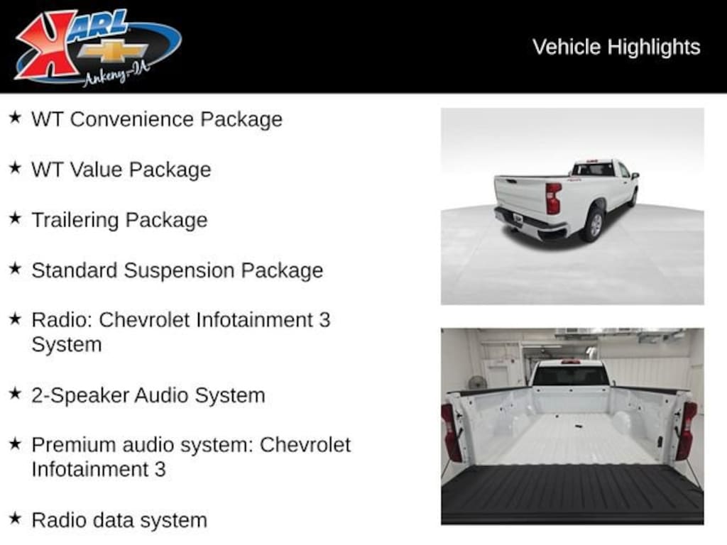 Factory MSRP: $48,200 $4,294 off MSRP! 10-Speed Automatic, 4WD, Jet Black Vinyl, 120-Volt Bed Mounted Power Outlet, 120-Volt Interior Power Outlet, 2-Speaker Audio System, 3.5 Monochromatic Display Driver Info Center, 4-Way Manual Driver Seat Adjuster, 40/20/40 Front Split Bench Seat, Air Conditioning, Automatic Emergency Braking, Bluetooth® For Phone, Brake assist, Compass, Deep-Tinted Glass, Dual front side impact airbags, Electric Rear-Window Defogger, Electronic Stability Control, Emergency communication system: OnStar, EZ Lift Power Lock & Release Tailgate, Following Distance Indicator, Forward Collision Alert, Front Pedestrian Braking, Front reading lights, Front wheel independent suspension, HD Rear Vision Camera, Heated Power-Adjustable Outside Mirrors, Hitch Guidance, Illuminated entry, IntelliBeam Automatic High Beam On/Off, Lane Keep Assist w/Lane Departure Warning, Locking Tailgate, Low tire pressure warning, Manual Tailgate Function w/No EZ Lift, Manual Tilt Wheel Steering Column, OnStar Services Capable, Overhead console, Power door mirrors, Power windows, Premium audio system: Chevrolet Infotainment 3, Radio data system, Radio: Chevrolet Infotainment 3 System, Rear step bumper, Remote keyless entry, Solar Absorbing Tinted Glass, Standard Suspension Package, Standard Tailgate, Tachometer, Teen Driver, Tilt steering wheel, Trailering Package, Wheels: 17 x 8 Bright Silver Painted Aluminum, Wheels: 17 x 8 Ultra Silver Painted Steel, Wi-Fi Hot Spot Capable, WT Convenience Package, WT Value Package.Summit White 2026 Chevrolet Silverado 1500 WT 2D Standard Cab EcoTec3 5.3L V8 10-Speed Automatic 4WD Price includes: $1000 - GM Bonus Cash. Exp. 11/03/2025 $2000 - Chevrolet Consumer Cash Program. Exp. 11/03/2025