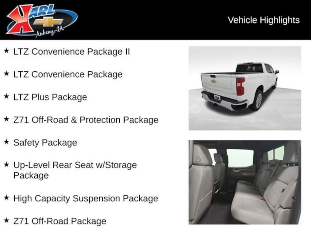 Factory MSRP: $66,990 $5,929 off MSRP! 10-Speed Automatic, 4WD, Gideon/Very Dark Atmosphere Leather, 10-Way Power Driver Seat w/Lumbar, 10-Way Power Passenger Seat Adjuster w/Lumbar, 12.3 Multicolor Reconfigurable Digital Display, 2 USB Data Ports, 2nd Row Heated Outboard Seats, Adaptive Cruise Control, All-Weather Floor Liner (LPO) (AAK), Apple CarPlay/Android Auto, Bumpers: chrome, Chevytec Spray-On Black Bedliner, Chrome Mirror Caps, Dual Exhaust w/Black Exhaust Tips, Dual Exhaust w/Polished Outlets, Electronic Transmission Range Selector Shifter, Floor Mounted Center Console, Front Black Bowtie Emblem (LPO), Front Bucket Seats, Front Center Armrest, Front LED Fog Lamps, HD Surround Vision, Heated door mirrors, Heated Driver & Front Outboard Passenger Seats, Heavy-Duty Air Filter, High Capacity Suspension Package, Hill Descent Control, Hitch Guidance, IntelliBeam Automatic High Beam On/Off, LED Cargo Area Lighting, LTZ Convenience Package, LTZ Convenience Package II, LTZ Plus Package, Multi-Flex Tailgate, Off-Road Suspension, Outside Heated Power-Adjustable Mirrors, Perforated Leather-Appointed Front Seat Trim, Perimeter Lighting, Power door mirrors, Power passenger seat, Power Sliding Rear Window w/Rear Defogger, Power Tailgate, Power Tilt & Telescoping Steering Column, Premium audio system: Chevrolet Infotainment 3 Premium, Premium Bose 7-Speaker Sound System, Radio: Chevrolet Infotainment 3 Premium System, Rear Cross Traffic Braking, Rear Pedestrian Alert, Safety Alert Seat, Safety Package, Split folding rear seat, Trailer Camera Provisions, Trailer Side Blind Zone Alert, Trailering Package, Ultrasonic Front & Rear Park Assist, Universal Home Remote, Up-Level Rear Seat w/Storage Package, Ventilated Driver & Front Passenger Seats, Wheels: 20 x 9 Sterling Silver Painted Aluminum, Wireless Charging, Z71 Off-Road & Protection Package, Z71 Off-Road Package.