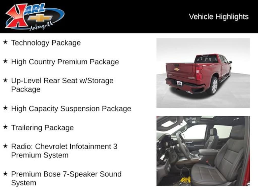 Factory MSRP: $74,670 $5,847 off MSRP! 10-Speed Automatic, 4WD, Black Leather, 10-Way Power Driver Seat w/Lumbar, 10-Way Power Passenger Seat Adjuster w/Lumbar, 12.3 Multicolor Reconfigurable Digital Display, 15 Diagonal Multicolor Head-Up Display, 2nd Row Heated Outboard Seats, Adaptive Ride Control Suspension, All-Weather Floor Liner (LPO), Apple CarPlay/Android Auto, Bodyside moldings, Bumpers: body-color, Chevytec Spray-On Black Bedliner, Chrome Assist Steps, Dual Exhaust w/Polished Outlets, Electronic Transmission Range Selector Shifter, Front Bucket Seats, Front Center Armrest, Front LED Fog Lamps, Galvano Silver Painted Mirror Caps, Heated door mirrors, Heated Driver & Front Outboard Passenger Seats, Heated rear seats, High Capacity Suspension Package, High Country Premium Package, Hitch Guidance, Integrated Trailer Brake Controller, IntelliBeam Automatic High Beam On/Off, LED Cargo Area Lighting, Multi-Flex Tailgate, Outside Heated Power-Adjustable Mirrors, Perforated Leather Seat Trim, Power passenger seat, Power Sunroof, Premium audio system: Chevrolet Infotainment 3 Premium, Premium Bose 7-Speaker Sound System, Radio: Chevrolet Infotainment 3 Premium System, Rear Camera Mirror, Split folding rear seat, Technology Package, Trailering Package, Up-Level Rear Seat w/Storage Package, Ventilated Driver & Front Passenger Seats, Wheels: 22 x 9 Painted Aluminum.