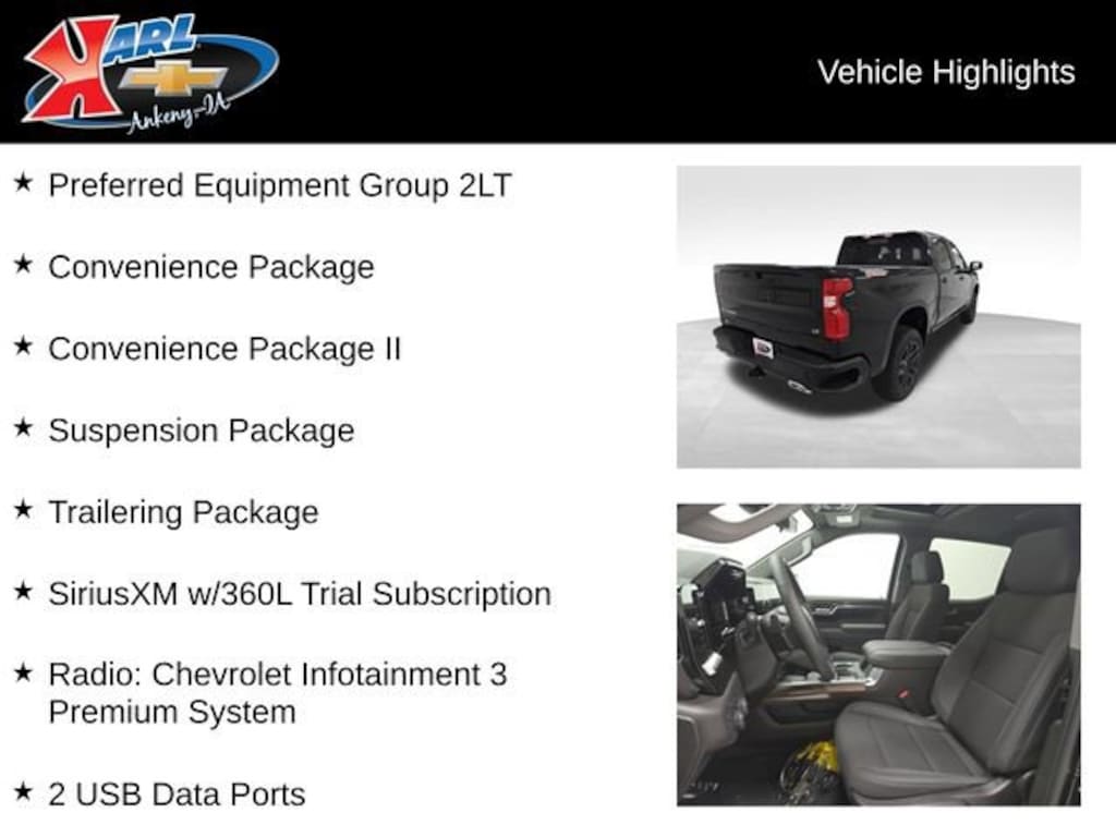 Factory MSRP: $66,890 $4,975 off MSRP! 10-Speed Automatic, 4WD, Black Cloth, 10-Way Power Driver Seat w/Lumbar, 12.3 Multicolor Reconfigurable Digital Display, 120-Volt Bed Mounted Power Outlet, 120-Volt Interior Power Outlet, 2 USB Data Ports, 6-Speaker Audio System, All-Weather Floor Liner (LPO) (AAK), Apple CarPlay/Android Auto, Auto-Locking Rear Differential, Bluetooth® For Phone, Color-Keyed Carpeting Floor Covering, Convenience Package, Convenience Package II, Deep-Tinted Glass, Dual Exhaust w/Polished Outlets, Dual Rear USB Ports (Charge Only), Dual-Zone Automatic Climate Control, Electric Rear-Window Defogger, Electronic Cruise Control, Electronic Transmission Range Selector Shifter, EZ Lift Power Lock & Release Tailgate, Floor Mounted Center Console, Front Bucket Seats, Front LED Fog Lamps, Front License Plate Kit, HD Rear Vision Camera, Heated door mirrors, Heated Driver & Front Outboard Passenger Seats, Heated Power-Adjustable Outside Mirrors, Heated Steering Wheel, Heavy-Duty Air Filter, High Gloss Black Mirror Caps, Hill Descent Control, Hitch Guidance, Hitch Guidance w/Hitch View, In-Vehicle Trailering System App, Inside Rear-View Mirror w/Tilt, Integrated Trailer Brake Controller, IntelliBeam Automatic High Beam On/Off, Keyless Open & Start, LED Cargo Area Lighting, Manual Tilt/Telescoping Steering Column, OnStar Services Capable, Performance Red Recovery Hooks, Power Front Windows w/Driver Express Up/Down, Power Front Windows w/Passenger Express Down, Power Rear Windows w/Express Down, Power Sliding Rear Window w/Rear Defogger, Power Sunroof, Power Tailgate, Preferred Equipment Group 2LT, Premium audio system: Chevrolet Infotainment 3 Premium, Premium Bose 7-Speaker Sound System, Radio: Chevrolet Infotainment 3 Premium System, Rear 60/40 Folding Bench Seat (Folds Up), Remote Vehicle Starter System, SiriusXM w/360L Trial Subscription, Split folding rear seat, Standard Tailgate, Steering Wheel Audio Controls, Suspension Package, Teen Driver, Theft Deterrent System (Unauthorized Entry), Tire Pressure Monitoring System, Trailering Package, Universal Home Remote, Wheels: 20 x 9 High Gloss Black Painted Alum, Wi-Fi Hot Spot Capable, Wireless Charging, Wrapped Steering Wheel.