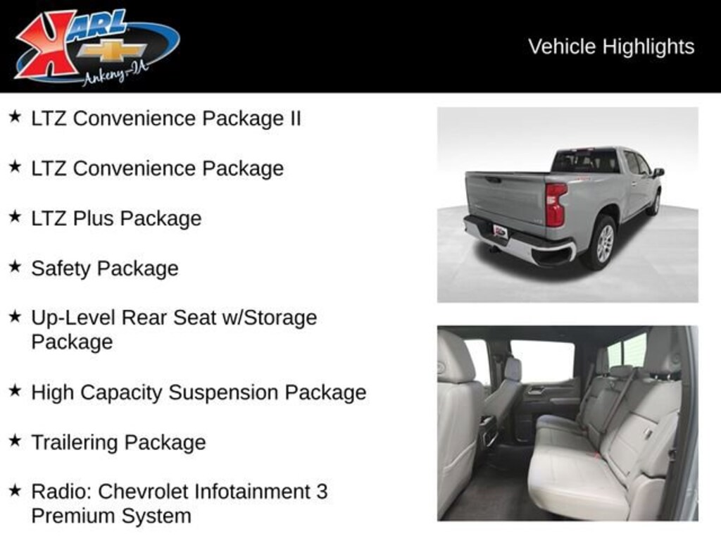 Factory MSRP: $64,945 $5,776 off MSRP! 10-Speed Automatic, 4WD, Gideon/Very Dk Atmosphere Leather, 10-Way Power Driver Seat w/Lumbar, 10-Way Power Passenger Seat Adjuster w/Lumbar, 12.3 Multicolor Reconfigurable Digital Display, 2 USB Data Ports, 2nd Row Heated Outboard Seats, Adaptive Cruise Control, Apple CarPlay/Android Auto, Bumpers: chrome, Chrome Mirror Caps, Electronic Transmission Range Selector Shifter, Floor Mounted Center Console, Front Bucket Seats, Front Center Armrest, Front LED Fog Lamps, HD Surround Vision, Heated door mirrors, Heated Driver & Front Outboard Passenger Seats, High Capacity Suspension Package, Hitch Guidance, Integrated Trailer Brake Controller, IntelliBeam Automatic High Beam On/Off, LED Cargo Area Lighting, LTZ Convenience Package, LTZ Convenience Package II, LTZ Plus Package, Outside Heated Power-Adjustable Mirrors, Perforated Leather-Appointed Front Seat Trim, Perimeter Lighting, Power door mirrors, Power passenger seat, Power Sliding Rear Window w/Rear Defogger, Power Tailgate, Power Tilt & Telescoping Steering Column, Premium audio system: Chevrolet Infotainment 3 Premium, Premium Bose 7-Speaker Sound System, Radio: Chevrolet Infotainment 3 Premium System, Rear Cross Traffic Braking, Rear Pedestrian Alert, Safety Alert Seat, Safety Package, Split folding rear seat, Trailer Camera Provisions, Trailer Side Blind Zone Alert, Trailering Package, Ultrasonic Front & Rear Park Assist, Universal Home Remote, Up-Level Rear Seat w/Storage Package, Ventilated Driver & Front Passenger Seats, Wheels: 20 x 9 Sterling Silver Painted Aluminum, Wireless Charging.