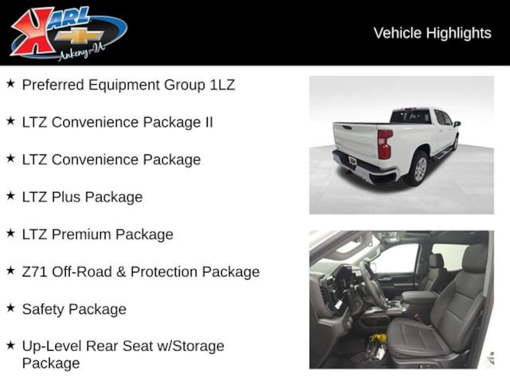 Factory MSRP: $67,780 $6,163 off MSRP! 10-Speed Automatic, 4WD, Jet Blk Perforated Lth-Ap Leather, 10-Way Power Driver Seat w/Lumbar, 10-Way Power Passenger Seat Adjuster w/Lumbar, 12.3 Multicolor Reconfigurable Digital Display, 120-Volt Bed Mounted Power Outlet, 120-Volt Interior Power Outlet, 2 USB Data Ports, 2nd Row Heated Outboard Seats, 6 Rectangular Chrome Tubular Assist Steps (LPO), Adaptive Cruise Control, All-Weather Floor Liner (LPO) (AAK), Apple CarPlay/Android Auto, Auto-Dimming Inside Rear-View Mirror, Auto-Locking Rear Differential, Bluetooth® For Phone, Bumpers: chrome, Chevytec Spray-On Black Bedliner, Chrome Mirror Caps, Color-Keyed Carpeting Floor Covering, Deep-Tinted Glass, Driver Memory, Dual Exhaust w/Black Exhaust Tips, Dual Exhaust w/Polished Outlets, Dual Rear USB Ports (Charge Only), Electric Rear-Window Defogger, Electronic Cruise Control, Electronic Transmission Range Selector Shifter, Floor Mounted Center Console, Front Bucket Seats, Front Center Armrest, Front Frame-Mounted Black Recovery Hooks, Front LED Fog Lamps, Front License Plate Kit, Front Rain-Sensing Wipers, Front Rubberized Vinyl Floor Mats, HD Surround Vision, Heated door mirrors, Heated Driver & Front Outboard Passenger Seats, Heated Steering Wheel, Heavy-Duty Air Filter, High Capacity Suspension Package, Hill Descent Control, Hitch Guidance, Hitch Guidance w/Hitch View, In-Vehicle Trailering System App, Integrated Trailer Brake Controller, IntelliBeam Automatic High Beam On/Off, Keyless Open & Start, LED Cargo Area Lighting, LTZ Convenience Package, LTZ Convenience Package II, LTZ Plus Package, LTZ Premium Package, Off-Road Suspension, OnStar Services Capable, Outside Heated Power-Adjustable Mirrors, Perforated Leather-Appointed Front Seat Trim, Perimeter Lighting, Power Front Passenger Windows w/Express Up/Down, Power Front Windows w/Driver Express Up/Down, Power passenger seat, Power Rear Windows w/Express Down, Power Sliding Rear Window w/Rear Defogger, Power Sunroof, Power Tailgate, Power Tilt & Telescoping Steering Column, Preferred Equipment Group 1LZ, Premium audio system: Chevrolet Infotainment 3 Premium, Premium Bose 7-Speaker Sound System, Radio: Chevrolet Infotainment 3 Premium System, Rear Cross Traffic Braking, Rear Pedestrian Alert, Rear Rubberized-Vinyl Floor Mats, Rear Wheelhouse Liners, Remote Vehicle Starter System, Safety Alert Seat, Safety Package, SiriusXM w/360L Trial Subscription, Split folding rear seat, Standard Tailgate, Steering Wheel Audio Controls, Teen Driver, Theft Deterrent System (Unauthorized Entry), Tire Pressure Monitoring System, Trailer Camera Provisions, Trailer Side Blind Zone Alert, Trailering Package, Ultrasonic Front & Rear Park Assist, Universal Home Remote, Up-Level Rear Seat w/Storage Package, Ventilated Driver & Front Passenger Seats, Wheels: 20 x 9 Sterling Silver Painted Aluminum, Wheels: 22 6-Spoke Low Gloss Black (LPO), Wheels: 22 Transit Steel (LPO), Wi-Fi Hot Spot Capable, Wireless Charging, Wrapped Steering Wheel, Z71 Off-Road & Protection Package, Z71 Off-Road Package.