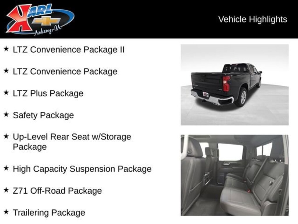 Factory MSRP: $66,095 $5,862 off MSRP! 10-Speed Automatic, 4WD, Black Leather, 10-Way Power Driver Seat w/Lumbar, 10-Way Power Passenger Seat Adjuster w/Lumbar, 12.3 Multicolor Reconfigurable Digital Display, 2 USB Data Ports, 2nd Row Heated Outboard Seats, Adaptive Cruise Control, Apple CarPlay/Android Auto, Bumpers: chrome, Chrome Mirror Caps, Dual Exhaust w/Black Exhaust Tips, Dual Exhaust w/Polished Outlets, Electronic Transmission Range Selector Shifter, Floor Mounted Center Console, Front Bucket Seats, Front Center Armrest, Front LED Fog Lamps, HD Surround Vision, Heated door mirrors, Heated Driver & Front Outboard Passenger Seats, Heavy-Duty Air Filter, High Capacity Suspension Package, Hill Descent Control, Hitch Guidance, Integrated Trailer Brake Controller, IntelliBeam Automatic High Beam On/Off, LED Cargo Area Lighting, LTZ Convenience Package, LTZ Convenience Package II, LTZ Plus Package, Off-Road Suspension, Outside Heated Power-Adjustable Mirrors, Perforated Leather-Appointed Front Seat Trim, Perimeter Lighting, Power passenger seat, Power Sliding Rear Window w/Rear Defogger, Power Tailgate, Power Tilt & Telescoping Steering Column, Premium audio system: Chevrolet Infotainment 3 Premium, Premium Bose 7-Speaker Sound System, Radio: Chevrolet Infotainment 3 Premium System, Rear Cross Traffic Braking, Rear Pedestrian Alert, Safety Alert Seat, Safety Package, Split folding rear seat, Trailer Camera Provisions, Trailer Side Blind Zone Alert, Trailering Package, Ultrasonic Front & Rear Park Assist, Universal Home Remote, Up-Level Rear Seat w/Storage Package, Ventilated Driver & Front Passenger Seats, Ventilated front seats, Wheels: 20 x 9 Sterling Silver Painted Aluminum, Wireless Charging, Z71 Off-Road Package.