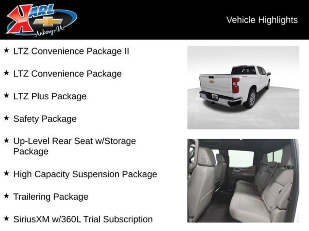 Factory MSRP: $65,750 $5,836 off MSRP! 10-Speed Automatic, 4WD, Gideon/Very Dk Atmosphere Leather, 120-Volt Bed Mounted Power Outlet, 120-Volt Interior Power Outlet, 2 USB Data Ports, 2nd Row Heated Outboard Seats, Adaptive Cruise Control, Air Conditioning, AM/FM radio: SiriusXM with 360L, Automatic temperature control, Bluetooth® For Phone, Brake assist, Delay-off headlights, Dual front impact airbags, Dual front side impact airbags, Electric Rear-Window Defogger, Electronic Stability Control, Emergency communication system: OnStar, Floor Mounted Center Console, Front dual zone A/C, Fully automatic headlights, HD Surround Vision, High Capacity Suspension Package, Hitch Guidance, Keyless Open & Start, LTZ Convenience Package, LTZ Convenience Package II, LTZ Plus Package, Occupant sensing airbag, Overhead airbag, Perimeter Lighting, Power Front Passenger Windows w/Express Up/Down, Power Front Windows w/Driver Express Up/Down, Power Sliding Rear Window w/Rear Defogger, Power steering, Power Tailgate, Power Tilt & Telescoping Steering Column, Power windows, Premium audio system: Chevrolet Infotainment 3 Premium, Premium Bose 7-Speaker Sound System, Radio: Chevrolet Infotainment 3 Premium System, Rain sensing wipers, Rear Cross Traffic Braking, Rear Pedestrian Alert, Remote keyless entry, Safety Alert Seat, Safety Package, SiriusXM w/360L Trial Subscription, Steering wheel mounted audio controls, Trailer Camera Provisions, Trailer Side Blind Zone Alert, Trailering Package, Ultrasonic Front & Rear Park Assist, Universal Home Remote, Up-Level Rear Seat w/Storage Package, Ventilated Driver & Front Passenger Seats, Wireless Charging.