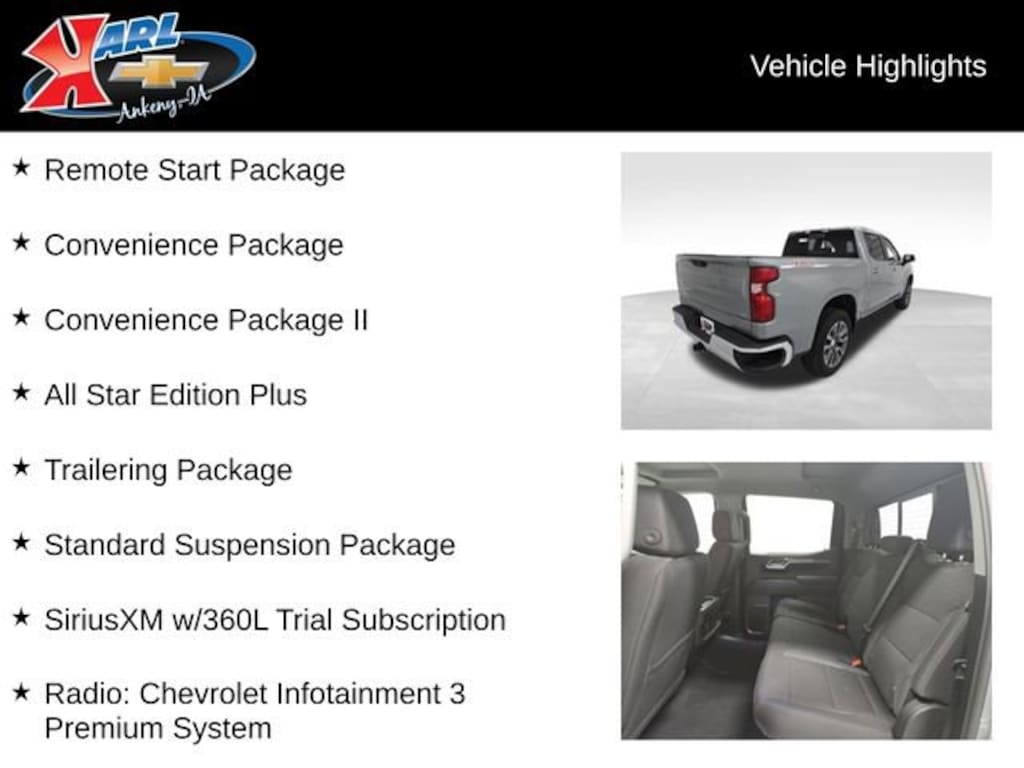 Factory MSRP: $60,810 $5,705 off MSRP! 10-Speed Automatic, 4WD, Black Cloth, 10-Way Power Driver Seat w/Lumbar, 120-Volt Bed Mounted Power Outlet, 120-Volt Interior Power Outlet, 2 USB Data Ports, 40/20/40 Front Split-Bench Seat, 6-Speaker Audio System, Air Conditioning, All Star Edition Plus, All-Weather Floor Liner (LPO), AM/FM radio: SiriusXM with 360L, Apple CarPlay/Android Auto, Automatic temperature control, Chevytec Spray-On Black Bedliner, Convenience Package, Convenience Package II, Dual Rear USB Ports (Charge Only), Dual-Zone Automatic Climate Control, Electric Rear-Window Defogger, Floor Mounted Center Console, Following Distance Indicator, Front Pedestrian Braking, Front Rubberized Vinyl Floor Mats, Heated door mirrors, Heated Driver & Front Outboard Passenger Seats, Heated front seats, Heated Steering Wheel, Heated steering wheel, Hitch Guidance, Hitch Guidance w/Hitch View, In-Vehicle Trailering System App, Inside Rear-View Mirror w/Tilt, Keyless Open & Start, Lane Keep Assist w/Lane Departure Warning, LED Cargo Area Lighting, Manual Tilt/Telescoping Steering Column, Outside temperature display, Overhead console, Power Front Windows w/Driver Express Up/Down, Power Front Windows w/Passenger Express Down, Power Sliding Rear Window w/Rear Defogger, Power steering, Radio: Chevrolet Infotainment 3 Premium System, Rear 60/40 Folding Bench Seat (Folds Up), Remote Start Package, Remote Vehicle Starter System, SiriusXM w/360L Trial Subscription, Standard Suspension Package, Teen Driver, Telescoping steering wheel, Theft Deterrent System (Unauthorized Entry), Trailering Package, Universal Home Remote, Wheels: 20 x 9 Painted Aluminum, Wireless Charging, Wrapped Steering Wheel.