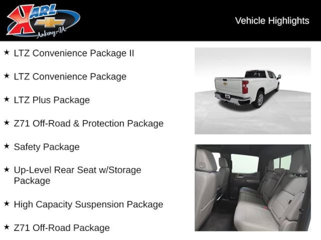 Factory MSRP: $70,135 $5,656 off MSRP! 10-Speed Automatic, 4WD, Gideon/Very Dark Atmosphere Leather, 12.3 Multicolor Reconfigurable Digital Display, 120-Volt Bed Mounted Power Outlet, 120-Volt Interior Power Outlet, 15 Diagonal Multicolor Head-Up Display, 2 USB Data Ports, 2nd Row Heated Outboard Seats, Adaptive Cruise Control, Air Conditioning, All-Weather Floor Liner (LPO) (AAK), AM/FM radio: SiriusXM with 360L, Auto-Dimming Inside Rear-View Mirror, Auto-dimming Rear-View mirror, Automatic temperature control, Bed View Camera, Bluetooth® For Phone, Brake assist, Chevytec Spray-On Black Bedliner, Color-Keyed Carpeting Floor Covering, Deep-Tinted Glass, Dual Exhaust w/Black Exhaust Tips, Dual Exhaust w/Polished Outlets, Dual front impact airbags, Dual front side impact airbags, Dual Rear USB Ports (Charge Only), Electric Rear-Window Defogger, Electronic Cruise Control, Electronic Stability Control, Electronic Transmission Range Selector Shifter, Floor Mounted Center Console, Forward Collision Alert, Front anti-roll bar, Front Center Armrest, Front dual zone A/C, Front Pedestrian Braking, Front reading lights, HD Surround Vision, Heated door mirrors, Heated Driver & Front Outboard Passenger Seats, Heated front seats, Heated Steering Wheel, Heated steering wheel, Heavy-Duty Air Filter, High Capacity Suspension Package, Hill Descent Control, Hitch Guidance, Hitch Guidance w/Hitch View, In-Vehicle Trailering System App, Integrated Trailer Brake Controller, IntelliBeam Automatic High Beam On/Off, Keyless Open & Start, LED Cargo Area Lighting, Low tire pressure warning, LTZ Convenience Package, LTZ Convenience Package II, LTZ Plus Package, Multi-Flex Tailgate, Off-Road Suspension, Outside Heated Power-Adjustable Mirrors, Perforated Leather-Appointed Front Seat Trim, Perimeter Lighting, Power Front Passenger Windows w/Express Up/Down, Power Front Windows w/Driver Express Up/Down, Power passenger seat, Power Rear Windows w/Express Down, Power Sliding Rear Window w/Rear Defogger, Power Tailgate, Power Tilt & Telescoping Steering Column, Power windows, Premium audio system: Chevrolet Infotainment 3 Premium, Premium Bose 7-Speaker Sound System, Pwr-Adjustable Vertical Trailering Outside Mirrors, Rain sensing wipers, Rear Cross Traffic Braking, Rear Pedestrian Alert, Rear step bumper, Rear Wheelhouse Liners, Rear window defroster, Remote keyless entry, Safety Alert Seat, Safety Package, SiriusXM w/360L Trial Subscription, Standard Tailgate, Steering wheel mounted audio controls, Teen Driver, Telescoping steering wheel, Trailer Camera Provisions, Trailer Side Blind Zone Alert, Ultrasonic Front & Rear Park Assist, Universal Home Remote, Up-Level Rear Seat w/Storage Package, Ventilated Driver & Front Passenger Seats, Wheels: 20 x 9 Sterling Silver Painted Aluminum, Wi-Fi Hot Spot Capable, Wireless Charging, Z71 Off-Road & Protection Package, Z71 Off-Road Package.