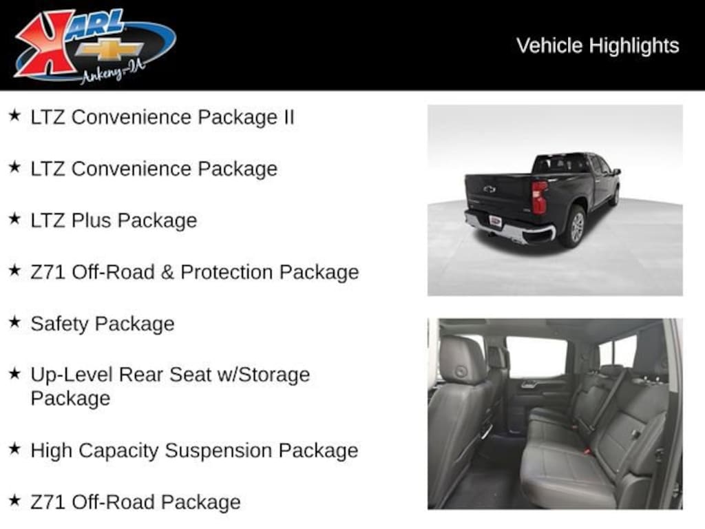 Factory MSRP: $67,985 $5,504 off MSRP! 10-Speed Automatic, 4WD, Black Leather, 10-Way Power Driver Seat w/Lumbar, 10-Way Power Passenger Seat Adjuster w/Lumbar, 12.3 Multicolor Reconfigurable Digital Display, 2 USB Data Ports, 2nd Row Heated Outboard Seats, Adaptive Cruise Control, All-Weather Floor Liner (LPO) (AAK), Apple CarPlay/Android Auto, Bumpers: chrome, Chevytec Spray-On Black Bedliner, Chrome Mirror Caps, Dual Exhaust w/Black Exhaust Tips, Dual Exhaust w/Polished Outlets, Electronic Transmission Range Selector Shifter, Floor Mounted Center Console, Front Black Bowtie Emblem (LPO), Front Bucket Seats, Front Center Armrest, Front LED Fog Lamps, HD Surround Vision, Heated door mirrors, Heated Driver & Front Outboard Passenger Seats, Heavy-Duty Air Filter, High Capacity Suspension Package, Hill Descent Control, Hitch Guidance, Integrated Trailer Brake Controller, IntelliBeam Automatic High Beam On/Off, LED Cargo Area Lighting, LTZ Convenience Package, LTZ Convenience Package II, LTZ Plus Package, Multi-Flex Tailgate, Off-Road Suspension, Outside Heated Power-Adjustable Mirrors, Perforated Leather-Appointed Front Seat Trim, Perimeter Lighting, Power passenger seat, Power Sliding Rear Window w/Rear Defogger, Power Tailgate, Power Tilt & Telescoping Steering Column, Premium audio system: Chevrolet Infotainment 3 Premium, Premium Bose 7-Speaker Sound System, Radio: Chevrolet Infotainment 3 Premium System, Rear Cross Traffic Braking, Rear Pedestrian Alert, Safety Alert Seat, Safety Package, Split folding rear seat, Trailer Camera Provisions, Trailer Side Blind Zone Alert, Trailering Package, Ultrasonic Front & Rear Park Assist, Universal Home Remote, Up-Level Rear Seat w/Storage Package, Ventilated Driver & Front Passenger Seats, Wheels: 20 x 9 Sterling Silver Painted Aluminum, Wireless Charging, Z71 Off-Road & Protection Package, Z71 Off-Road Package.
