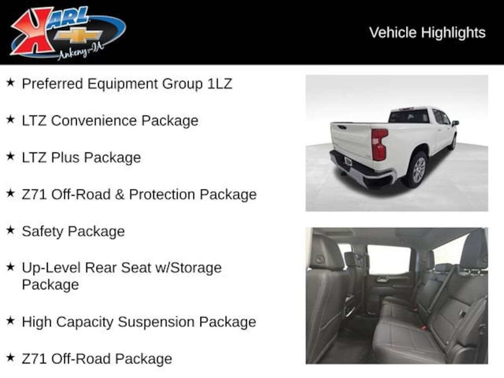 Factory MSRP: $66,380 $6,134 off MSRP! 10-Speed Automatic, 4WD, Black Leather, 10-Way Power Driver Seat w/Lumbar, 10-Way Power Passenger Seat Adjuster w/Lumbar, 12.3 Multicolor Reconfigurable Digital Display, 120-Volt Bed Mounted Power Outlet, 120-Volt Interior Power Outlet, 2 USB Data Ports, All-Weather Floor Liner (LPO) (AAK), Apple CarPlay/Android Auto, Auto-Dimming Inside Rear-View Mirror, Auto-Locking Rear Differential, Bluetooth® For Phone, Bumpers: chrome, Chevytec Spray-On Black Bedliner, Chrome Mirror Caps, Color-Keyed Carpeting Floor Covering, Deep-Tinted Glass, Driver Memory, Dual Exhaust w/Black Exhaust Tips, Dual Exhaust w/Polished Outlets, Dual Rear USB Ports (Charge Only), Electric Rear-Window Defogger, Electronic Cruise Control, Electronic Transmission Range Selector Shifter, Floor Mounted Center Console, Front Bucket Seats, Front Center Armrest, Front Frame-Mounted Black Recovery Hooks, Front LED Fog Lamps, Front Rain-Sensing Wipers, Front Rubberized Vinyl Floor Mats, HD Surround Vision, Heated door mirrors, Heated Driver & Front Outboard Passenger Seats, Heated Steering Wheel, Heavy-Duty Air Filter, High Capacity Suspension Package, Hill Descent Control, Hitch Guidance, Hitch Guidance w/Hitch View, In-Vehicle Trailering System App, Integrated Trailer Brake Controller, IntelliBeam Automatic High Beam On/Off, Keyless Open & Start, LED Cargo Area Lighting, LTZ Convenience Package, LTZ Plus Package, Off-Road Suspension, OnStar Services Capable, Outside Heated Power-Adjustable Mirrors, Perforated Leather-Appointed Front Seat Trim, Perimeter Lighting, Power Front Passenger Windows w/Express Up/Down, Power Front Windows w/Driver Express Up/Down, Power passenger seat, Power Rear Windows w/Express Down, Power Tailgate, Power Tilt & Telescoping Steering Column, Preferred Equipment Group 1LZ, Premium audio system: Chevrolet Infotainment 3 Premium, Premium Bose 7-Speaker Sound System, Radio: Chevrolet Infotainment 3 Premium System, Rear Cross Traffic Braking, Rear Pedestrian Alert, Rear Rubberized-Vinyl Floor Mats, Rear Wheelhouse Liners, Remote Vehicle Starter System, Safety Alert Seat, Safety Package, SiriusXM w/360L Trial Subscription, Split folding rear seat, Standard Tailgate, Steering Wheel Audio Controls, Teen Driver, Theft Deterrent System (Unauthorized Entry), Tire Pressure Monitoring System, Trailer Camera Provisions, Trailer Side Blind Zone Alert, Trailering Package, Ultrasonic Front & Rear Park Assist, Up-Level Rear Seat w/Storage Package, Ventilated Driver & Front Passenger Seats, Wheels: 20 x 9 Sterling Silver Painted Aluminum, Wi-Fi Hot Spot Capable, Wireless Charging, Wrapped Steering Wheel, Z71 Off-Road & Protection Package, Z71 Off-Road Package.