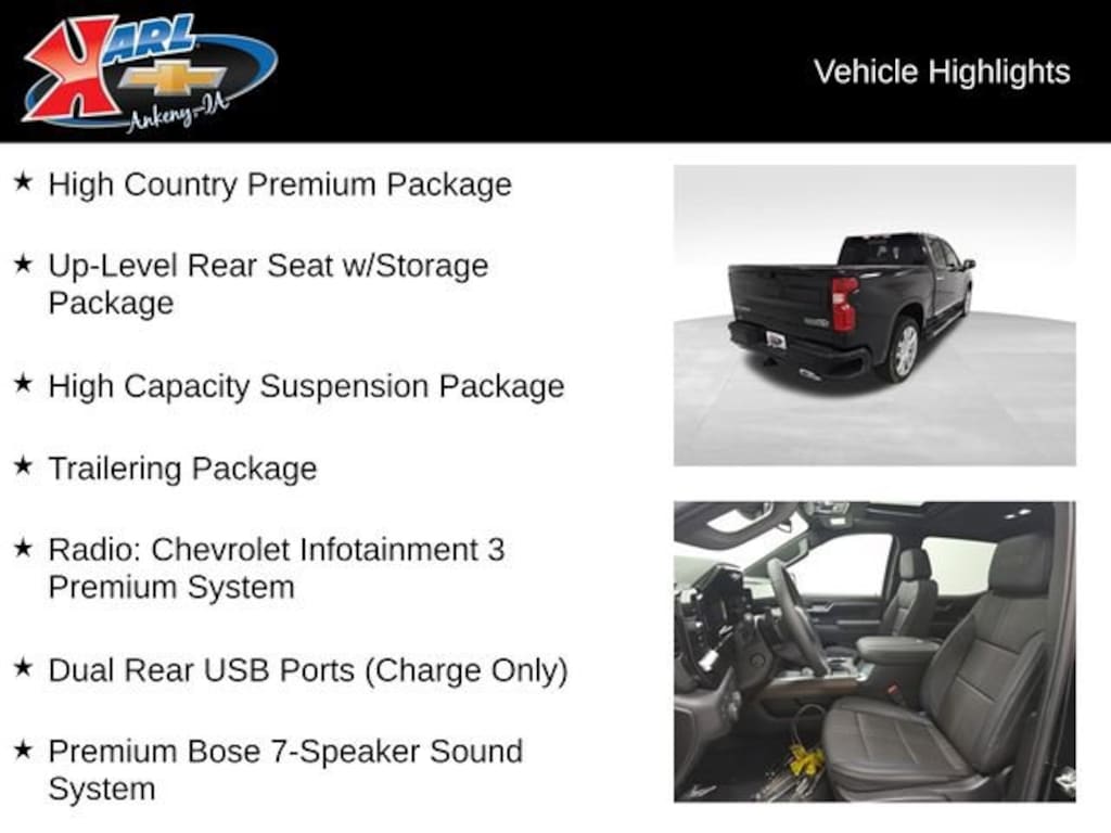 Factory MSRP: $72,575 $5,690 off MSRP! 10-Speed Automatic, 4WD, Black Leather, 10-Way Power Driver Seat w/Lumbar, 120-Volt Bed Mounted Power Outlet, 120-Volt Interior Power Outlet, 2nd Row Heated Outboard Seats, Adaptive Cruise Control, Air Conditioning, All-Weather Floor Liner (LPO), AM/FM radio: SiriusXM with 360L, Automatic temperature control, Bluetooth® For Phone, Brake assist, Chevytec Spray-On Black Bedliner, Chrome Assist Steps, Color-Keyed Carpeting Floor Covering, Deep-Tinted Glass, Delay-off headlights, Dual front impact airbags, Dual Rear USB Ports (Charge Only), Electric Rear-Window Defogger, Electronic Stability Control, Electronic Transmission Range Selector Shifter, Emergency communication system: OnStar, Floor Mounted Center Console, Following Distance Indicator, Forward Collision Alert, Front anti-roll bar, Front Bucket Seats, Front Carpeted Floor Mats, Front dual zone A/C, Front LED Fog Lamps, Front Pedestrian Braking, Front Rain-Sensing Wipers, Fully automatic headlights, HD Surround Vision, Heated Driver & Front Outboard Passenger Seats, Heated rear seats, Heated Steering Wheel, Heated steering wheel, High Capacity Suspension Package, High Country Premium Package, Hitch Guidance, In-Vehicle Trailering System App, IntelliBeam Automatic High Beam On/Off, Keyless Open & Start, Lane Keep Assist w/Lane Departure Warning, LED Cargo Area Lighting, Low tire pressure warning, Outside Heated Power-Adjustable Mirrors, Power door mirrors, Power Front Passenger Windows w/Express Up/Down, Power passenger seat, Power Rear Windows w/Express Down, Power Sliding Rear Window w/Rear Defogger, Power Sunroof, Power Tailgate, Power windows, Premium audio system: Chevrolet Infotainment 3 Premium, Premium Bose 7-Speaker Sound System, Radio data system, Radio: Chevrolet Infotainment 3 Premium System, Rain sensing wipers, Rear Carpeted Floor Mats, Rear Cross Traffic Braking, Rear Pedestrian Alert, Rear Wheelhouse Liners, Rear window defroster, Remote keyless entry, Speed-sensing steering, Split folding rear seat, Standard Tailgate, Tachometer, Teen Driver, Tilt steering wheel, Traction control, Trailer Side Blind Zone Alert, Trailering Package, Universal Home Remote, Up-Level Rear Seat w/Storage Package, Wheels: 20 x 9 Painted Aluminum, Wheels: 22 x 9 Painted Aluminum, Wi-Fi Hot Spot Capable.