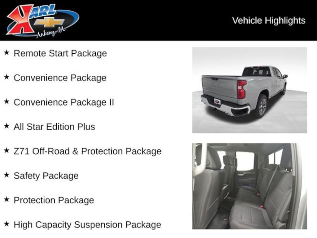 Factory MSRP: $60,155 $5,730 off MSRP! 10-Speed Automatic, 4WD, Black Cloth, 10-Way Power Driver Seat w/Lumbar, 120-Volt Bed Mounted Power Outlet, 120-Volt Interior Power Outlet, 2 USB Data Ports, Air Conditioning, All Star Edition Plus, All-Star Edition, All-Weather Floor Liner (LPO) (AAK), Automatic temperature control, Bumpers: chrome, Chevytec Spray-On Black Bedliner, Cloth Seat Trim, Color-Keyed Carpeting Floor Covering, Compass, Convenience Package, Convenience Package II, Driver vanity mirror, Dual Exhaust w/Polished Outlets, Dual Rear USB Ports (Charge Only), Dual-Zone Automatic Climate Control, Electric Rear-Window Defogger, Electronic Transmission Range Selector Shifter, Floor Mounted Center Console, Forward Collision Alert, Front Bucket Seats, Front dual zone A/C, Front Pedestrian Braking, Front Rubberized Vinyl Floor Mats, HD Surround Vision, Heated door mirrors, Heated Driver & Front Outboard Passenger Seats, Heated front seats, Heated Power-Adjustable Outside Mirrors, Heated Steering Wheel, Heavy-Duty Air Filter, High Capacity Suspension Package, Hill Descent Control, Hitch Guidance, Hitch Guidance w/Hitch View, In-Vehicle Trailering System App, IntelliBeam Automatic High Beam On/Off, Keyless Open & Start, LED Cargo Area Lighting, Manual Tilt/Telescoping Steering Column, Off-Road Suspension, Perimeter Lighting, Power Front Windows w/Driver Express Up/Down, Power Rear Windows w/Express Down, Power Sliding Rear Window w/Rear Defogger, Power windows, Premium audio system: Chevrolet Infotainment 3 Premium, Protection Package, Radio: Chevrolet Infotainment 3 Premium System, Rear 60/40 Folding Bench Seat (Folds Up), Rear Cross Traffic Braking, Rear Pedestrian Alert, Rear Wheelhouse Liners, Rear window defroster, Remote keyless entry, Remote Start Package, Remote Vehicle Starter System, Safety Package, Standard Suspension Package, Theft Deterrent System (Unauthorized Entry), Trailer Camera Provisions, Trailer Side Blind Zone Alert, Trailering Package, Ultrasonic Front & Rear Park Assist, Universal Home Remote, Wheels: 18 x 8.5 Bright Silver Painted Aluminum, Wheels: 20 x 9 Painted Aluminum, Wireless Charging, Wrapped Steering Wheel, Z71 Off-Road & Protection Package, Z71 Off-Road Package.