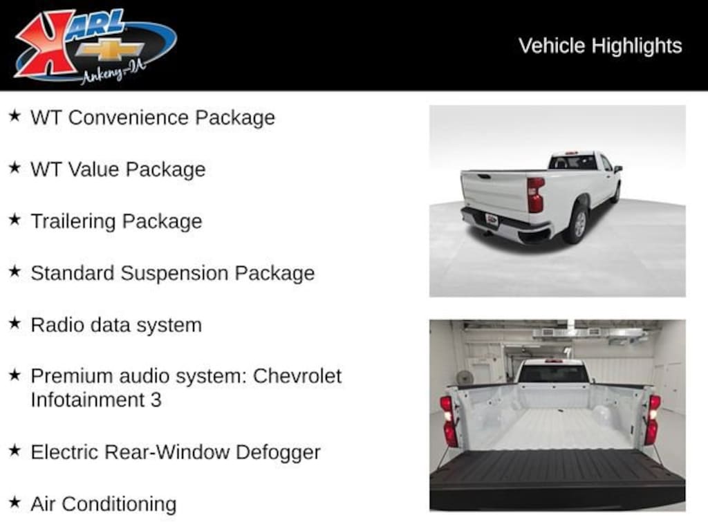 Factory MSRP: $42,950 $4,135 off MSRP! 10-Speed Automatic, Jet Blk Vinyl, 3.5 Monochromatic Display Driver Info Center, 4-Way Manual Driver Seat Adjuster, 40/20/40 Front Split Bench Seat, Air Conditioning, Apple CarPlay/Android Auto, Black (Semi-Gloss) Rear Bumper, Bluetooth® For Phone, Brake assist, Deep-Tinted Glass, Driver door bin, Dual front side impact airbags, Electric Rear-Window Defogger, Electronic Cruise Control, Electronic Stability Control, Emergency communication system: OnStar, Following Distance Indicator, Front Center Armrest w/Storage, Front Pedestrian Braking, Front wheel independent suspension, HD Rear Vision Camera, Heated door mirrors, Heated Power-Adjustable Outside Mirrors, Hitch Guidance, Lane Keep Assist w/Lane Departure Warning, Low tire pressure warning, Manual Tailgate Function w/No EZ Lift, Manual Tilt Wheel Steering Column, Outside temperature display, Overhead console, Power windows, Premium audio system: Chevrolet Infotainment 3, Radio data system, Rear step bumper, Remote keyless entry, Standard Suspension Package, Standard Tailgate, Tachometer, Teen Driver, Tilt steering wheel, Trailering Package, Voltmeter, Wheels: 17 x 8 Bright Silver Painted Aluminum, WT Convenience Package, WT Value Package.Summit White 2026 Chevrolet Silverado 1500 WT 2D Standard Cab EcoTec3 5.3L V8 10-Speed Automatic RWD Price includes: $1000 - GM Bonus Cash. Exp. 11/03/2025 $2000 - Chevrolet Consumer Cash Program. Exp. 11/03/2025