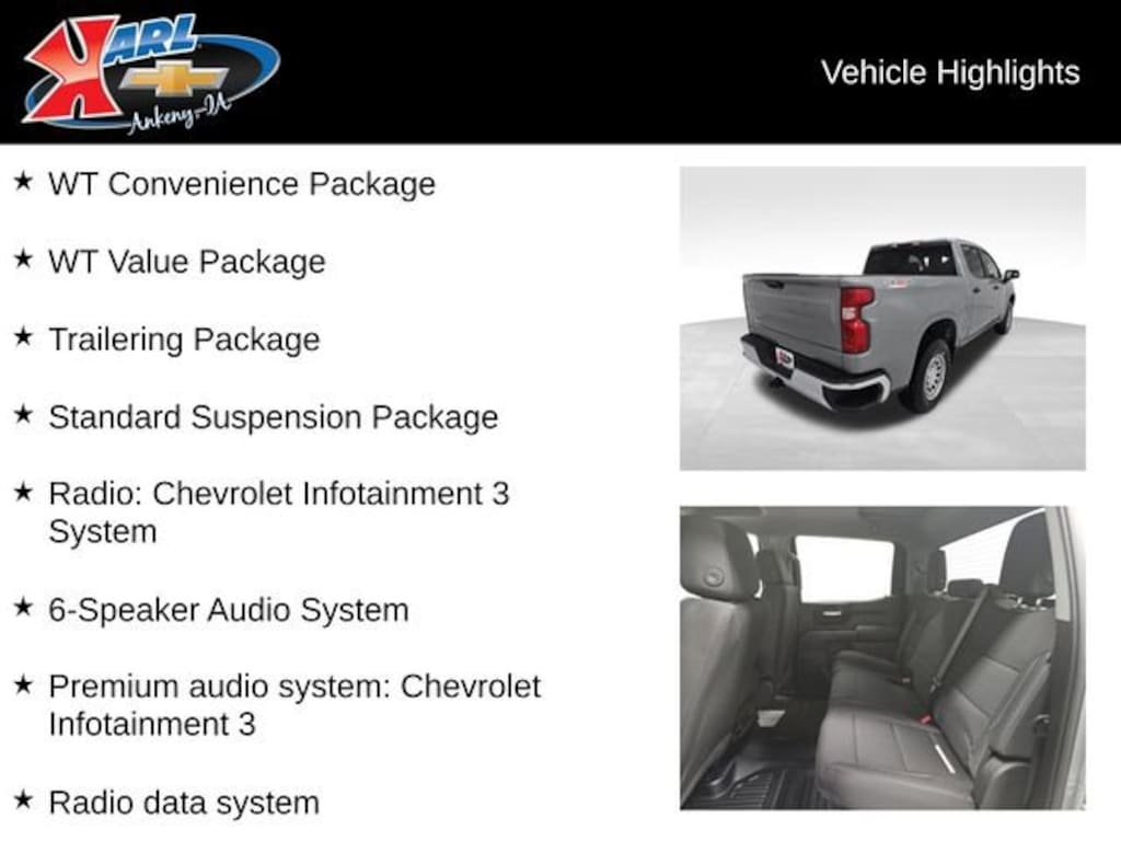 Factory MSRP: $51,540 $5,080 off MSRP! 10-Speed Automatic, 4WD, Jet Blk Clth Vinyl, 3.5 Monochromatic Display Driver Info Center, 4-Way Manual Driver Seat Adjuster, 40/20/40 Front Split-Bench Seat, 6-Speaker Audio System, Apple CarPlay/Android Auto, Black (Semi-Gloss) Front Bumper, Black (Semi-Gloss) Rear Bumper, Bluetooth® For Phone, Deep-Tinted Glass, Dual front side impact airbags, Electric Rear-Window Defogger, Electronic Cruise Control, Electronic Stability Control, Emergency communication system: OnStar, Following Distance Indicator, Forward Collision Alert, Front Pedestrian Braking, Front wheel independent suspension, HD Rear Vision Camera, Heated Power-Adjustable Outside Mirrors, Hitch Guidance, Low tire pressure warning, Manual Tilt Wheel Steering Column, OnStar Services Capable, Outside temperature display, Passenger vanity mirror, Power steering, Premium audio system: Chevrolet Infotainment 3, Radio data system, Radio: Chevrolet Infotainment 3 System, Rear step bumper, Remote Keyless Entry, Remote keyless entry, Speed control, Speed-sensing steering, Split folding rear seat, Standard Suspension Package, Tachometer, Teen Driver, Traction control, Trailering Package, Wheels: 17 x 8 Ultra Silver Painted Steel, Wi-Fi Hot Spot Capable, WT Convenience Package, WT Value Package.Sterling 2026 Chevrolet Silverado 1500 WT 4D Crew Cab EcoTec3 5.3L V8 10-Speed Automatic 4WD Price includes: $1500 - GM Bonus Cash. Exp. 02/02/2026 $3250 - Chevrolet Consumer Cash Program. Exp. 02/02/2026