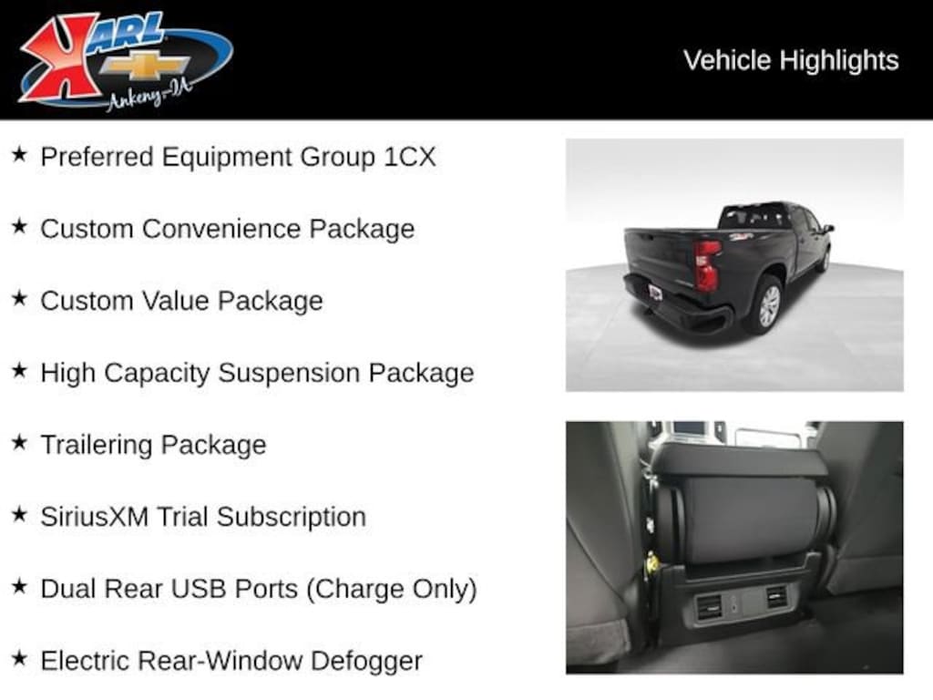 Factory MSRP: $50,030 $4,336 off MSRP! Priced below KBB Fair Purchase Price! 8-Speed Automatic, 4WD, Black Cloth, 10-Way Power Driver Seat w/Lumbar, 120-Volt Bed Mounted Power Outlet, 120-Volt Interior Power Outlet, 3.5 Monochromatic Display Driver Info Center, Bluetooth® For Phone, Color-Keyed Carpeting Floor Covering, Custom Convenience Package, Custom Value Package, Deep-Tinted Glass, Dual front impact airbags, Dual front side impact airbags, Dual Rear USB Ports (Charge Only), Electric Rear-Window Defogger, Electronic Cruise Control, Emergency communication system: OnStar, EZ Lift Power Lock & Release Tailgate, Front Frame-Mounted Black Recovery Hooks, Front Rubberized Vinyl Floor Mats, Front wheel independent suspension, HD Rear Vision Camera, High Capacity Suspension Package, Hitch Guidance, LED Cargo Area Lighting, Manual Tilt Wheel Steering Column, Occupant sensing airbag, OnStar Services Capable, Power Front Windows w/Driver Express Up/Down, Power Front Windows w/Passenger Express Down, Power Rear Windows w/Express Down, Preferred Equipment Group 1CX, Rear 60/40 Folding Bench Seat (Folds Up), Rear Rubberized-Vinyl Floor Mats, Remote Keyless Entry, Remote Vehicle Starter System, SiriusXM Trial Subscription, Standard Tailgate, Teen Driver, Theft Deterrent System (Unauthorized Entry), Tire Pressure Monitoring System, Trailering Package, Wheels: 20 x 9 Bright Silver Painted Aluminum, Wi-Fi Hot Spot Capable.