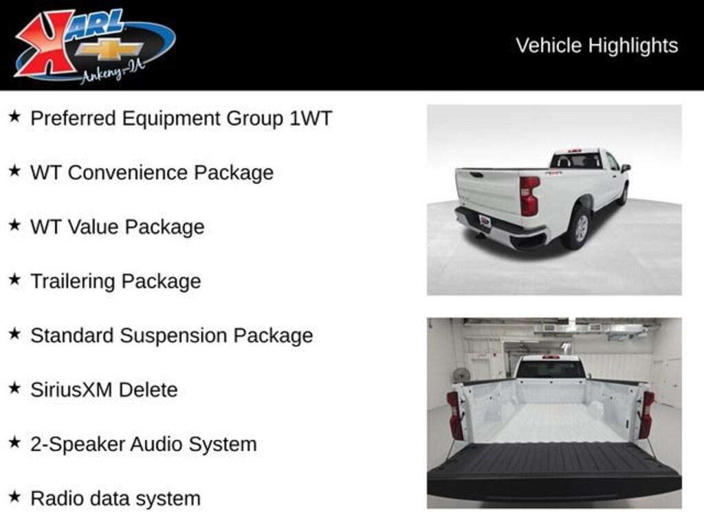 Summit White 2026 Chevrolet Silverado 1500 WT 2D Standard Cab 2.7L I4 Turbocharged DOHC 16V LEV3-SULEV30 310hp 8-Speed Automatic 4WD Price includes: $1000 - GM Bonus Cash. Exp. 11/03/2025 $1750 - Chevrolet Consumer Cash Program. Exp. 11/03/2025