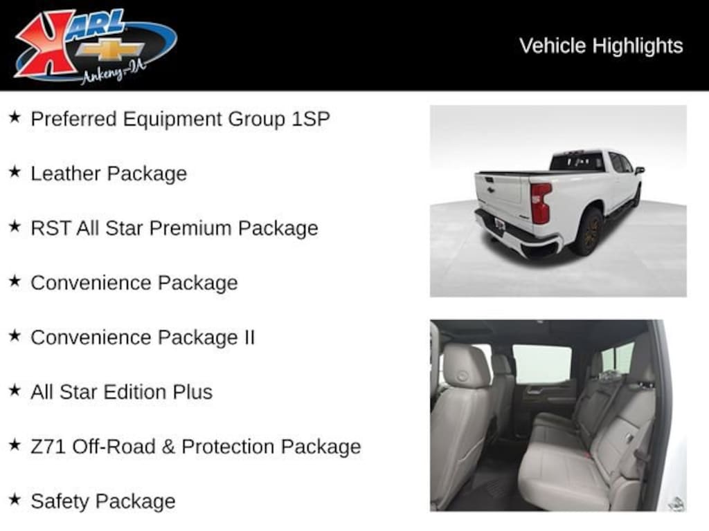 Factory MSRP: $66,230 $1,020 off MSRP! 10-Speed Automatic, 4WD, Gideon/Very Dark Atmosphere Leather, 10-Way Power Driver Seat w/Lumbar, 12.3 Multicolor Reconfigurable Digital Display, 120-Volt Bed Mounted Power Outlet, 120-Volt Interior Power Outlet, 2 USB Data Ports, 6-Speaker Audio System, Adaptive Cruise Control, All Star Edition Plus, All-Star Edition, All-Weather Floor Liner (LPO) (AAK), Apple CarPlay/Android Auto, Auto-Locking Rear Differential, Bluetooth® For Phone, Chevytec Spray-On Black Bedliner, Color-Keyed Carpeting Floor Covering, Convenience Package, Convenience Package II, Deep-Tinted Glass, Dual Exhaust w/Polished Outlets, Dual Rear USB Ports (Charge Only), Dual-Zone Automatic Climate Control, Electric Rear-Window Defogger, Electronic Cruise Control, Electronic Transmission Range Selector Shifter, EZ Lift Power Lock & Release Tailgate, Floor Mounted Center Console, Front Bucket Seats, Front Frame-Mounted Black Recovery Hooks, Front LED Fog Lamps, Front License Plate Kit, Front Rubberized Vinyl Floor Mats, HD Rear Vision Camera, HD Surround Vision, Heated door mirrors, Heated Driver & Front Outboard Passenger Seats, Heated Power-Adjustable Outside Mirrors, Heated Steering Wheel, Heavy-Duty Air Filter, High Gloss Black Mirror Caps, Hill Descent Control, Hitch Guidance, Hitch Guidance w/Hitch View, In-Vehicle Trailering System App, Inside Rear-View Mirror w/Tilt, Integrated Trailer Brake Controller, IntelliBeam Automatic High Beam On/Off, Keyless Open & Start, Leather Package, Leather-Appointed Front Seat Trim, LED Cargo Area Lighting, Manual Tilt/Telescoping Steering Column, Multi-Flex Tailgate, Off-Road Suspension, OnStar Services Capable, Perimeter Lighting, Power Front Windows w/Driver Express Up/Down, Power Front Windows w/Passenger Express Down, Power Rear Windows w/Express Down, Power Sliding Rear Window w/Rear Defogger, Preferred Equipment Group 1SP, Premium audio system: Chevrolet Infotainment 3 Premium, Premium Bose 7-Speaker Sound System, Protection Package, Radio: Chevrolet Infotainment 3 Premium System, Rear 60/40 Folding Bench Seat (Folds Up), Rear Cross Traffic Braking, Rear Pedestrian Alert, Rear Rubberized-Vinyl Floor Mats, Rear Wheelhouse Liners, Remote Vehicle Starter System, RST All Star Premium Package, Safety Package, SiriusXM w/360L Trial Subscription, Split folding rear seat, Standard Suspension Package, Standard Tailgate, Steering Wheel Audio Controls, Teen Driver, Theft Deterrent System (Unauthorized Entry), Tire Pressure Monitoring System, Trailer Camera Provisions, Trailer Side Blind Zone Alert, Trailering Package, Ultrasonic Front & Rear Park Assist, Universal Home Remote, Up-Level Rear Seat w/Storage Package, Wheels: 20 x 9 Painted Aluminum, Wi-Fi Hot Spot Capable, Wireless Charging, Wrapped Steering Wheel, Z71 Off-Road & Protection Package, Z71 Off-Road Package.Summit White 2026 Chevrolet Silverado 1500 RST 4D Crew Cab 3.0L I6 10-Speed Automatic 4WDThe dealer has added these accessories to this vehicle:- 4 GM BLACK STEPS ($980) 4 GM BLACK STEPS- BLACK EXHAUST BEZELS ($425) BLACK EXHAUST BEZELS- LEVELING KIT ($725) LEVELING KIT- GM SOFT TONNEAU COVER ($725) GM SOFT TONNEAU COVER- BLACKOUT LETTERING ($418) BLACKOUT LETTERING- AFTERMARKET WHEELS AND TIRES ($3,900) AFTERMARKET WHEELS AND TIRES. TAKE OFFS STAY WITH VEHICLE Price includes: $1500 - Chevrolet Consumer Cash Program. Exp. 12/01/2025 $1750 - GM Bonus Cash. Exp. 12/01/2025 Price includes $7,173 dealer added accessories.