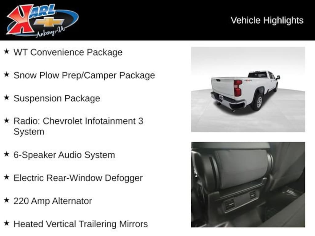 Factory MSRP: $54,885 $3,111 off MSRP! 10-Speed Automatic, 4WD, Jet Blk Clth Vinyl, 18 Painted Steel Wheels, 220 Amp Alternator, 3.5 Diagonal Monochromatic Display DIC, 6-Speaker Audio System, Apple CarPlay/Android Auto, Black Mirror Caps, Deep-Tinted Glass, Electric Rear-Window Defogger, EZ Lift Power Lock & Release Tailgate, Heated Vertical Trailering Mirrors, High-Visibility Vertical Trailering Mirrors, LED Smoked Amber Roof Marker Lamps, Manual Tailgate Function w/No EZ Lift, Radio: Chevrolet Infotainment 3 System, Rear 60/40 Folding Bench Seat (Folds Up), Snow Plow Prep/Camper Package, Split folding rear seat, Suspension Package, Vinyl Seat Trim, WT Convenience Package.