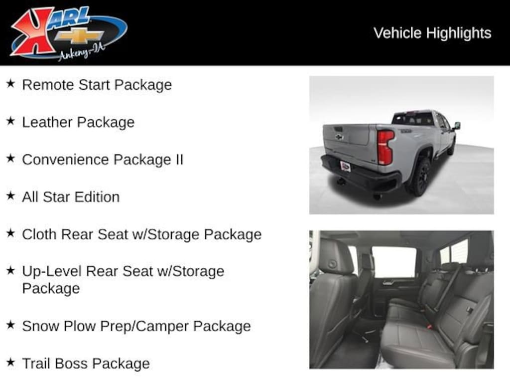 Factory MSRP: $78,584 $2,000 off MSRP! 10-Speed Automatic, 4WD, Jet Blk Lth-Appointed Fro Leather, 120-Volt Bed Mounted Power Outlet, 120-Volt Interior Power Outlet, 2 Charge/Data USB Ports Inside Center Console, 220 Amp Alternator, 3 Years SiriusXM, 6-Speaker Audio System, Air Conditioning, All Star Edition, AM/FM radio: SiriusXM with 360L, Animated LED Projector Headlamps, Apple CarPlay/Android Auto, Auto-Dimming Inside Rear-View Mirror, Bluetooth® For Phone, Body-Color Rear Bumper, Brake assist, Cloth Seat Trim, Color-Keyed Carpeting Floor Covering, Convenience Package II, Driver door bin, Dual front impact airbags, Dual front side impact airbags, Electric Rear-Window Defogger, Electronic Stability Control, Floor-Mounted Center Console, Front Bucket Seats, Front Frame-Mounted Red Recovery Hooks, Front Rubberized Vinyl Floor Mats, Front wheel independent suspension, Heat Package, Heated Steering Wheel, High Gloss Black Door Handles, High Gloss Black Front Bumper, High Gloss Black Mirror Caps, High Gloss Black Rear Bumper, Hill Descent Control, Leather Package, Low tire pressure warning, Occupant sensing airbag, Off-Road Suspension, OnStar Services Capable, Overhead console, Power Door Locks, Power steering, Power windows, Push Button Start, Radio: Chevrolet Infotainment 3 Premium System, Rear reading lights, Remote Start Package, Remote Vehicle Starter System, Snow Plow Prep/Camper Package, Suspension Package, Trail Boss Package, Unauthorized Entry Theft-Deterrent System, Universal Home Remote, Wheels: 20 High Gloss Black Painted, Wi-Fi Hotspot Capable, Wireless Charging, Wireless Phone Projection, Z71 Off-Road Package.