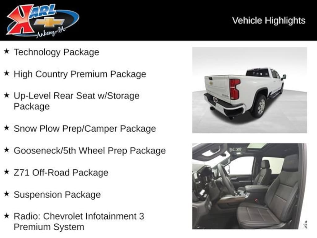 Factory MSRP: $89,099 $5,085 off MSRP! 10-Speed Automatic, 4WD, Jet Blk Perforated Lth Leather, 120-Volt Interior Power Outlet, 15 Diagonal Multicolor Head-Up Display, 220 Amp Alternator, 3 Years SiriusXM, 6 Rectangular Chromed Tubular Assist Steps, 720 Cold-Cranking Amps Heavy-Duty Battery, Air Conditioning, AM/FM radio: SiriusXM with 360L, BOSE Premium 7-Speaker Sound System, Brake assist, Bumpers: body-color, Chevrolet Connected Access Capable, Color-Keyed Carpeting Floor Covering, Deep-Tinted Glass, Driver Memory, Dual front side impact airbags, Durabed Pickup Bed, Electric Rear-Window Defogger, Electronic Stability Control, Emergency communication system: OnStar, Floor-Mounted Center Console, Front Center Armrest, Front dual zone A/C, Front fog lights, Front Rain-Sensing Wipers, Front wheel independent suspension, Garage door transmitter, Genuine wood door panel insert, Gooseneck/5th Wheel Prep Package, Heated door mirrors, Heated Steering Wheel, High Country Premium Package, Hill Descent Control, LED Cargo Area Lighting, Memory seat, Multi-Flex Tailgate, Off-Road Suspension, Perforated Leather Seat Trim, Power Door Locks, Power Sunroof, Power windows, Radio: Chevrolet Infotainment 3 Premium System, Rear Camera Mirror, Rear Wheelhouse Liners, Remote keyless entry, Snow Plow Prep/Camper Package, Speed-sensing steering, Split folding rear seat, Steering wheel mounted audio controls, Suspension Package, Technology Package, Ventilated front seats, Wheels: 20 8-Spoke Bright Finish Aluminum, Wireless Charging, Wireless Phone Projection, Wrapped Steering Wheel, Z71 Off-Road Package.