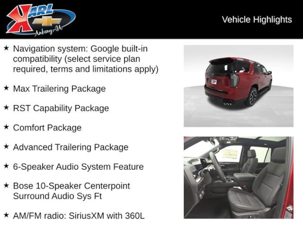 Factory MSRP: $81,760 4WD, Gnt Leather, 2-Speed Active Electronic AutoTrac Transfer Case, 2-Way Power Driver Lumbar Seat Adjuster, 2-Way Power Front Passenger Lumbar Seat Adjuster, 3rd Row 60/40 Power-Folding Split-Bench Seat, 3rd Row Manual 60/40 Split-Folding Bench Seats, 3rd row seats: split-bench, 6-Speaker Audio System Feature, 8-Way Power Front Passenger Seat Adjuster, Advanced Trailering Package, Air Conditioning, Air Ride Adaptive Suspension, AM/FM radio: SiriusXM with 360L, Automatic temperature control, Brake assist, Color-Keyed Carpeting Floor Covering, Comfort Package, Compass, Driver door bin, Driver vanity mirror, Dual Exhaust System, Dual front impact airbags, Dual front side impact airbags, Dual-Pane Power Panoramic Sunroof, Electronic Stability Control, Emergency communication system: OnStar and Chevrolet connected services capable, Floor Console, Front anti-roll bar, Front Bucket Seats, Front Center Armrest, Front dual zone A/C, Front LED Fog Lamps, Heated 2nd Row Outboard Seats, Heated door mirrors, Heated front seats, Heated Steering Wheel, Hill Descent Control, Integrated Trailer Brake Controller, Key Card, LED Tail Lamps, Magnetic Ride Control Suspension, Max Trailering Package, Memory seat, Memory Settings, Navigation system: Google built-in compatibility (select service plan required, terms and limitations apply), Occupant sensing airbag, Outside Heated Power-Adjustable Mirrors, Overhead airbag, Overhead console, Passenger vanity mirror, Power Liftgate, Power passenger seat, Power steering, Power windows, Rain sensing wipers, Rear air conditioning, Rear Power Liftgate, Rear reading lights, Rear seat center armrest, Rear window wiper, Remote keyless entry, Remote Start, RST Capability Package, Smart Trailer Integration Indicator, Split folding rear seat, Wheels: 22 x 9 Bright Machined, Wireless Phone Charging.