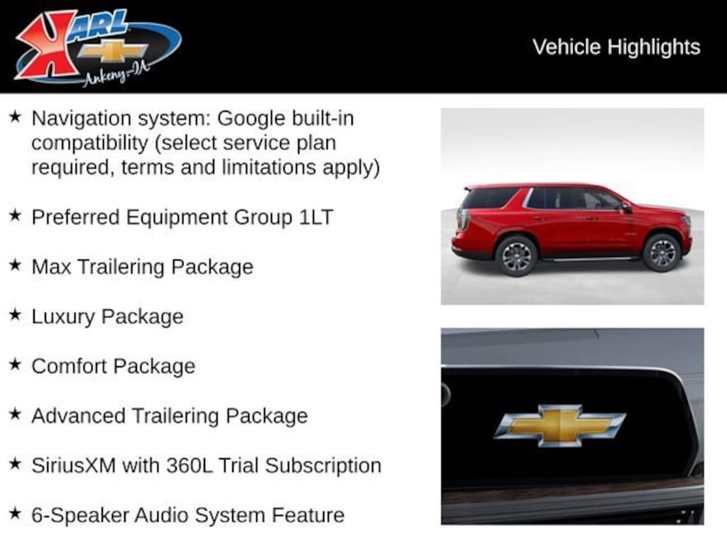 At Karl Chevrolet, we want to help you find the best new or used car in Ankeny that suits your needs. When you buy a new car at Karl Chevrolet, you know you're finding a vehicle you can rely on. We have a great selection of Platinum Quality Pre-Owned Vehicles. We also pride ourselves in creating a friendly atmosphere and a reliable Dealership that you can trust. Call us and our experts will be glad to help you! (515) 299-4300. *Equipment and options are generated by a 3rd party vendor, exact vehicle options may vary. Please see a salesperson for complete details and vehicle information.