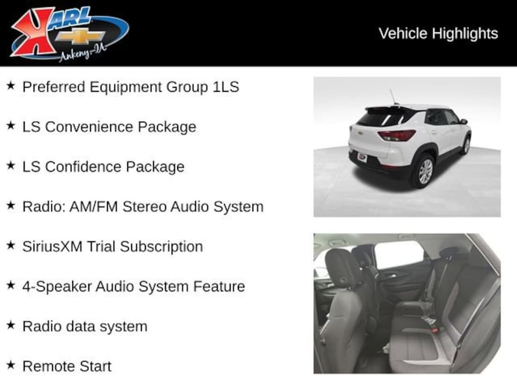 At Karl Chevrolet we want to help you find the best new or used car in Ankeny that suits your needs. When you buy a new car at Karl Chevrolet you know you're finding a vehicle you can rely on. We have a great selection of Platinum Quality Pre-Owned Vehicles. We also pride ourselves in creating a friendly atmosphere and a reliable Dealership that you can trust. Call us and our experts will be glad to help you! (515) 299-4300. *Equipment and options are generated by a 3rd party vendor, exact vehicle options may vary. Please see a salesperson for complete details and vehicle information. Price includes: $500 - GM Financial Standalone Special APR & Down Payment Assistance Program: $500 discount and 15.90% APR for 36 months. $35.11 per $1000 financed. Available to well qualified buyers who finance through GM Financial. XGU. Exp. 03/31/2026