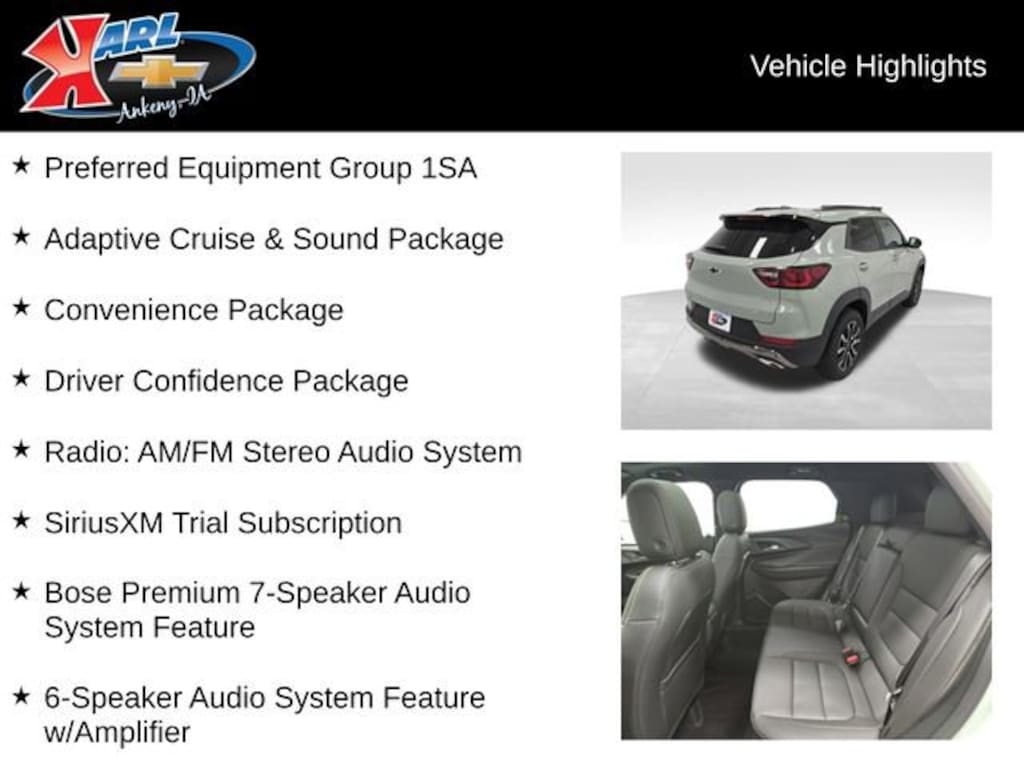 Factory MSRP: $35,470 $938 off MSRP! 26/29 City/Highway MPG 1 Type-A & 1 Type-C USB Charging-Only Ports, 1 Type-A & 1 Type-C USB Ports, 120-Volt Power Outlet, 2-Way Power Driver Lumbar Seat Adjuster, 4-Way Manual Front Passenger Seat Adjuster, 6-Speaker Audio System Feature w/Amplifier, Adaptive Cruise & Sound Package, Adaptive Cruise Control, Bose Premium 7-Speaker Audio System Feature, Cabin Humidity Sensor, Convenience Package, Dr & Fr Passenger Illuminated Vanity Mirrors, Driver Confidence Package, Dual-Pane Panoramic Power Sunroof, Evotex Seat Trim, Flat-Folding Front Passenger Seatback, Front Bucket Seats, Front Center Armrest, Hands Free Power Programmable Liftgate, Heated Driver & Front Passenger Seats, Inside Rear-View Auto-Dimming Mirror, Lane Change Alert w/Side Blind Zone Alert, Preferred Equipment Group 1SA, Radio: AM/FM Stereo Audio System, Rear Cross Traffic Alert, Rear Park Assist, Single-Zone Automatic Climate Control, SiriusXM Trial Subscription, Split folding rear seat, Wheels: 17 High Gloss Black Machined Aluminum, Wireless Apple CarPlay/Android Auto, Wireless Charging.
