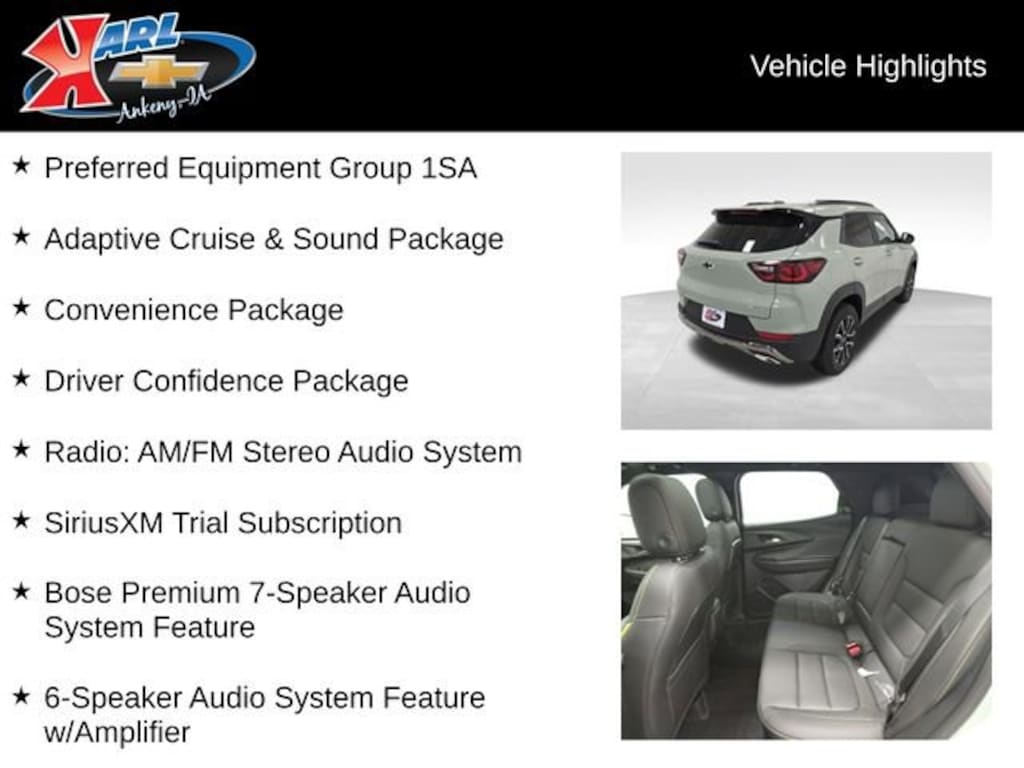 Factory MSRP: $35,470 $938 off MSRP! 26/29 City/Highway MPG 1 Type-A & 1 Type-C USB Charging-Only Ports, 1 Type-A & 1 Type-C USB Ports, 120-Volt Power Outlet, 2-Way Power Driver Lumbar Seat Adjuster, 4-Way Manual Front Passenger Seat Adjuster, 6-Speaker Audio System Feature w/Amplifier, Adaptive Cruise & Sound Package, Adaptive Cruise Control, Bose Premium 7-Speaker Audio System Feature, Cabin Humidity Sensor, Convenience Package, Dr & Fr Passenger Illuminated Vanity Mirrors, Driver Confidence Package, Dual-Pane Panoramic Power Sunroof, Evotex Seat Trim, Flat-Folding Front Passenger Seatback, Front Bucket Seats, Front Center Armrest, Hands Free Power Programmable Liftgate, Heated Driver & Front Passenger Seats, Inside Rear-View Auto-Dimming Mirror, Lane Change Alert w/Side Blind Zone Alert, Preferred Equipment Group 1SA, Radio: AM/FM Stereo Audio System, Rear Cross Traffic Alert, Rear Park Assist, Single-Zone Automatic Climate Control, SiriusXM Trial Subscription, Split folding rear seat, Wheels: 17 High Gloss Black Machined Aluminum, Wireless Apple CarPlay/Android Auto, Wireless Charging.