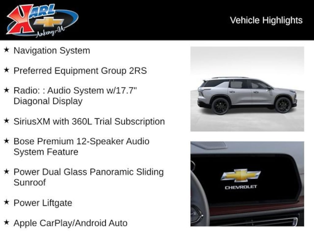 At Karl Chevrolet, we want to help you find the best new or used car in Ankeny that suits your needs. When you buy a new car at Karl Chevrolet, you know you're finding a vehicle you can rely on. We have a great selection of Platinum Quality Pre-Owned Vehicles. We also pride ourselves in creating a friendly atmosphere and a reliable Dealership that you can trust. Call us and our experts will be glad to help you! (515) 299-4300. *Equipment and options are generated by a 3rd party vendor, exact vehicle options may vary. Please see a salesperson for complete details and vehicle information.