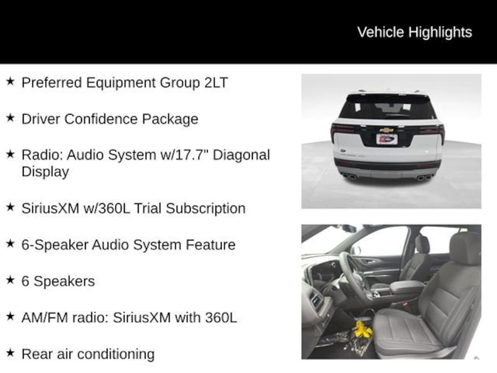 Factory MSRP: $45,920 $698 off MSRP! 3rd row seats: split-bench, 4-Way Manual Front Passenger Seat Adjuster, 6 Speakers, 6-Speaker Audio System Feature, 8-Way Power Driver Seat Adjuster, ABS brakes, Air Conditioning, AM/FM radio: SiriusXM with 360L, Apple CarPlay/Android Auto, Automatic temperature control, Brake assist, Child-Seat-Sensing Airbag, Compass, Driver Confidence Package, Driver vanity mirror, Dual front impact airbags, Dual front side impact airbags, Emergency communication system: OnStar, Front Bucket Seats, Front Center Armrest, Front dual zone A/C, HD Surround Vision, Heated Driver & Front Passenger Seats, Heated front seats, Key Card, Low tire pressure warning, Overhead airbag, Overhead console, Passenger vanity mirror, Power driver seat, Power Liftgate, Power Outlet, Power steering, Power windows, Preferred Equipment Group 2LT, Radio: Audio System w/17.7 Diagonal Display, Rear air conditioning, Rear Camera Mirror, Rear Pedestrian Alert, Rear window wiper, Remote keyless entry, SiriusXM w/360L Trial Subscription, Tachometer, Traffic Sign Recognition, Wheels: 18 Grazen Metallic Machined-Face Aluminum.