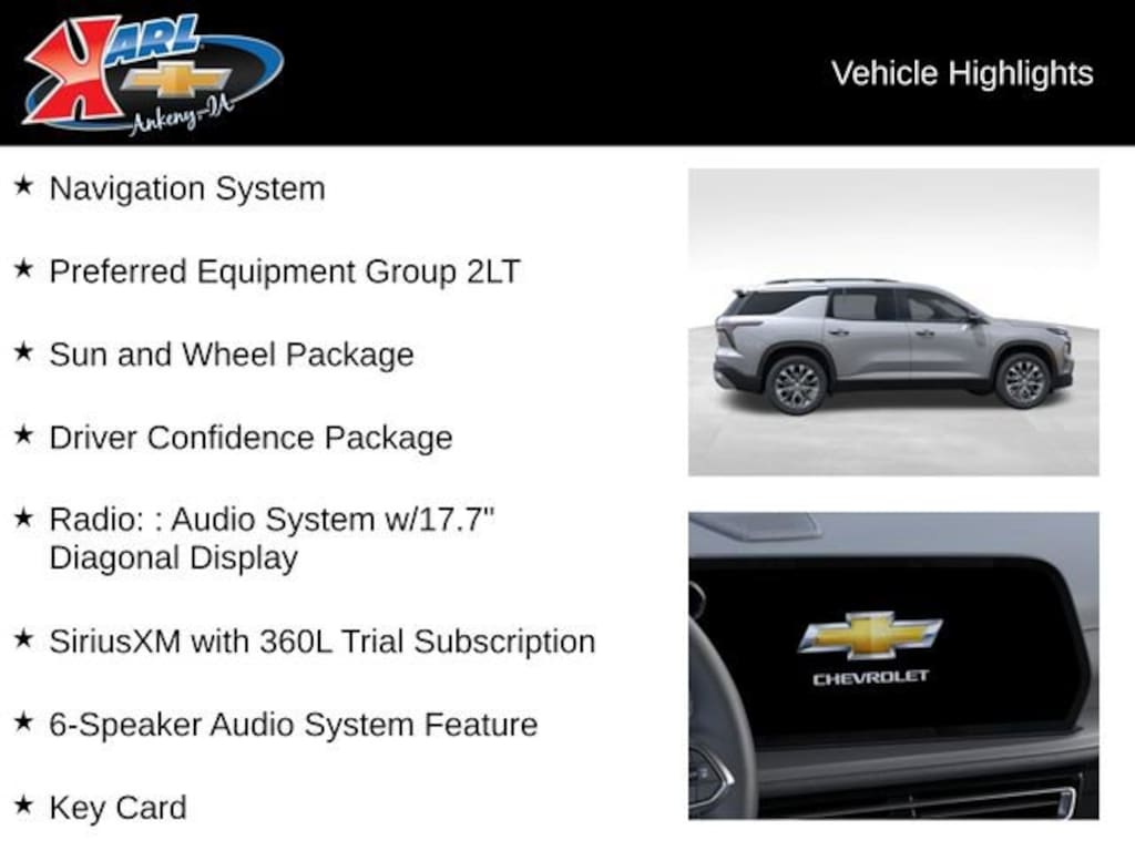 At Karl Chevrolet we want to help you find the best new or used car in Ankeny that suits your needs. When you buy a new car at Karl Chevrolet you know you're finding a vehicle you can rely on. We have a great selection of Platinum Quality Pre-Owned Vehicles. We also pride ourselves in creating a friendly atmosphere and a reliable Dealership that you can trust. Call us and our experts will be glad to help you! (515) 299-4300. *Equipment and options are generated by a 3rd party vendor, exact vehicle options may vary. Please see a salesperson for complete details and vehicle information.