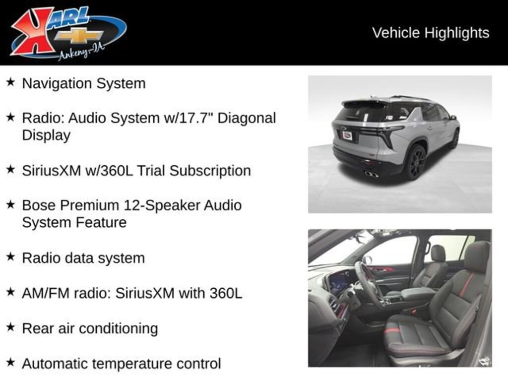 Factory MSRP: $60,795 AWD, 3rd row seats: split-bench, 6-Way Power Front Passenger Seat Adjuster, 8-Way Power Driver Seat Adjuster, Air Conditioning, AM/FM radio: SiriusXM with 360L, Automatic temperature control, Bose Premium 12-Speaker Audio System Feature, Brake assist, Child-Seat-Sensing Airbag, Driver 4-Way Power Lumbar Seat Adjuster, Driver vanity mirror, Dual front impact airbags, Dual front side impact airbags, Electronic Stability Control, Emergency communication system: OnStar, Exterior Parking Camera Rear, Front Center Armrest, Front Passenger 4-Way Power Lumbar Seat Adjuster, Front reading lights, Heated front seats, Heated rear seats, Heated steering wheel, Illuminated entry, Low tire pressure warning, Navigation System, Overhead airbag, Overhead console, Perforated Leather-Appointed Seat Trim, Power driver seat, Power Dual Glass Panoramic Sliding Sunroof, Power Liftgate, Power passenger seat, Power steering, Radio data system, Radio: Audio System w/17.7 Diagonal Display, Rain sensing wipers, Rear air conditioning, Rear window wiper, Remote keyless entry, SiriusXM w/360L Trial Subscription, Sport steering wheel, Steering wheel memory, Tachometer, Trip computer, Wheels: 22 High Gloss Black Painted Aluminum.