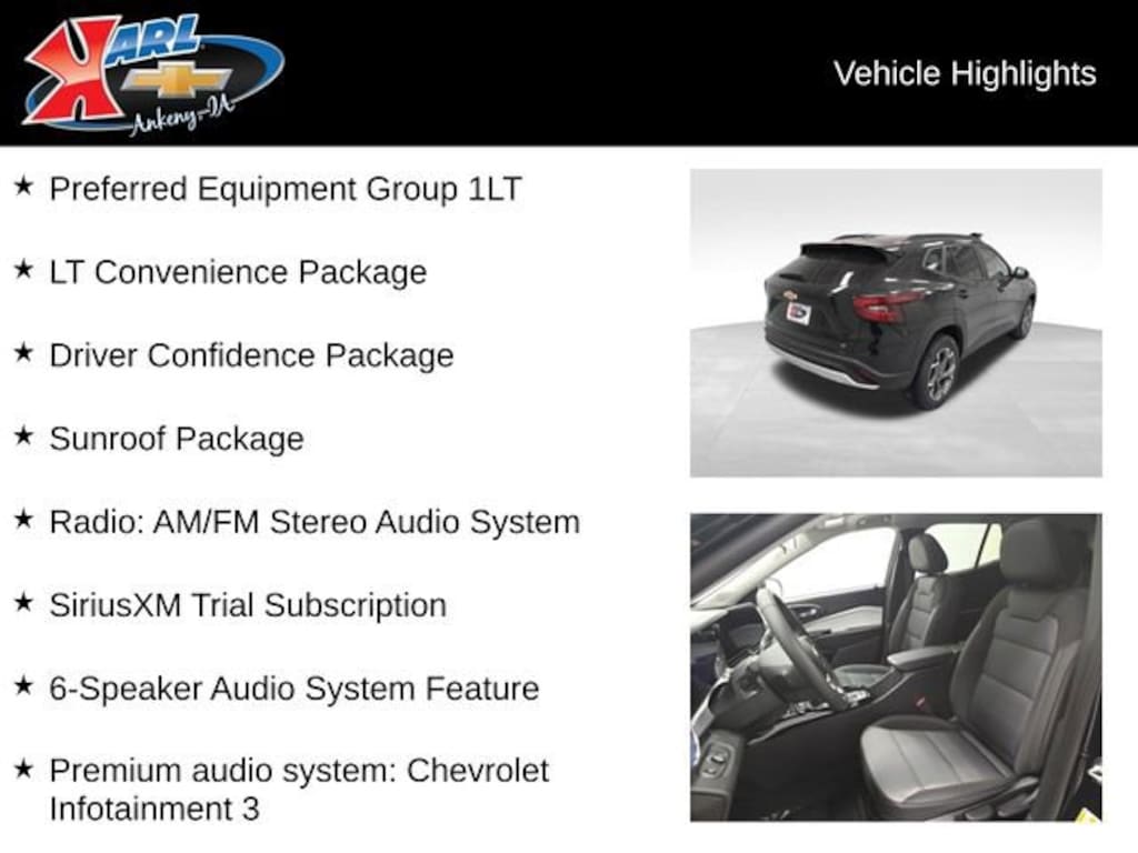 Certification Program Details: Karl Chevrolet of Ankeny, The Nation's #1 CarBravo Certified Dealer! Every CarBravo Certified vehicle includes: Comprehensive 126-Point Inspection Professionally inspected by factory-trained technicians to meet strict mechanical, safety, and cosmetic standards. 12-Month / 12,000-Mile Bumper-to-Bumper Limited Warranty Enjoy added peace of mind with extensive coverage from the day you drive off the lot. 24/7 Roadside Assistance & Courtesy Transportation Flat tire? Dead battery? Need a tow? You're covered anywhere, anytime throughout the warranty period. Vehicle History & Title Guarantee Clean title, completed safety recalls, and a full CARFAX® or AutoCheck® report provided for complete transparency. 10-Day / 500-Mile Exchange Promise If you don't absolutely love it, bring it back and exchange it no hassle, no stress. Experience peace of mind and premium protection exclusively from Karl Chevrolet of Ankeny, the Nation's #1 CarBravo Dealer! Wireless Apple CarPlay/Wireless Android Auto Wireless Charging Heated Steering Wheel Heated Driver and Front Passenger Seats Power Sliding Glass Sunroof with Manual Shade Adaptive Cruise Control Rear Park Assist Rear Cross Traffic Alert Lane Change Alert with Side Blind Zone Alert Premium audio system: Chevrolet Infotainment 3 Driver Confidence Package LT Convenience Package Preferred Equipment Group 1LT Sunroof PackageThe 2026 Chevrolet Trax LT In-Transit is a stylish and versatile crossover that offers a perfect blend of practicality and modern technology. Powered by the efficient ECOTEC 1.2L Turbo engine and paired with a smooth-shifting 6-Speed Automatic transmission, this Trax delivers an impressive 28 city / 32 highway MPG, making it an excellent choice for your daily commute or weekend adventures.Stepping inside, you'll be greeted by a well-appointed interior featuring premium cloth/Evotex seating, a 6-way manual driver's seat, and a 4-way manual front passenger seat. The Trax also boasts a wealth of advanced technology, including a premium Chevrolet Infotainment 3 system with wireless Apple CarPlay and Android Auto, a 6-speaker audio system, and wireless charging capabilities.For added convenience and peace of mind, this Trax comes equipped with a comprehensive suite of driver-assist technologies. Adaptive Cruise Control, Rear Park Assist, Rear Cross Traffic Alert, and Lane Change Alert with Side Blind Zone Alert help you navigate the road with confidence, while the power sliding glass sunroof and heated steering wheel and front seats provide a touch of luxury.Wrapped in a sleek Black exterior, the 2026 Chevrolet Trax LT In-Transit is a stylish and practical choice that will turn heads and make your daily drives more enjoyable. With its impressive list of features and the added protection of the CarBravo Certified program, this Trax is a must-see for any discerning buyer.At Karl Chevrolet we want to help you find the best new or used car in Ankeny that suits your needs. When you buy a new car at Karl Chevrolet you know you're finding a vehicle you can rely on. We have a great selection of Platinum Quality Pre-Owned Vehicles. We also pride ourselves in creating a friendly atmosphere and a reliable Dealership that you can trust. Call us and our experts will be glad to help you! (515) 299-4300. *Equipment and options are generated by a 3rd party vendor, exact vehicle options may vary. Please see a sale Price includes: $500 - Chevrolet GM Financial APR & NCC Consumer Cash Program: $500 discount and 5.69% APR for 36 months. $30.28 per $1000 financed. Available to well qualified buyers who finance through GM Financial. XGQ, NCC. Exp. 03/31/2026 This rebate is only available if you also take the 'Chevrolet GM Financial APR & NCC Consumer Cash Program: $500 discount and 5.69% APR for 36 m