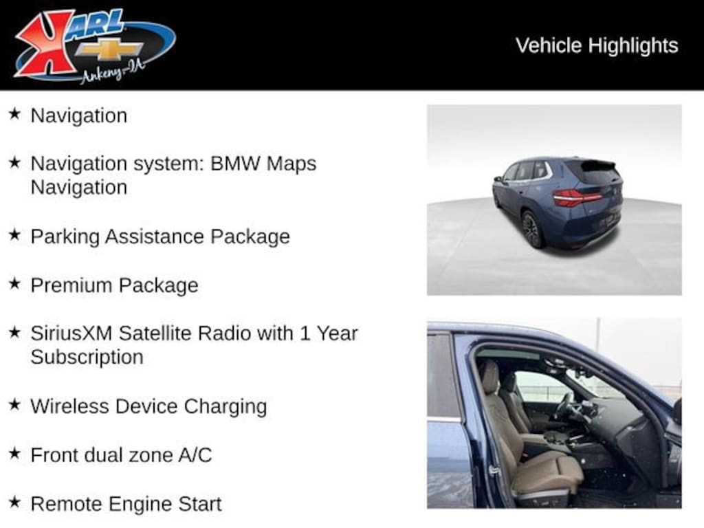 This exceptional 2025 BMW X3 30 xDrive 30 XDRIVE SPORTS ACT is a true standout in the luxury SUV segment. With its striking Blue exterior and premium features, this vehicle is designed to elevate your driving experience. Under the hood, the efficient I4 engine paired with an 8-Speed Automatic transmission and BMW's renowned xDrive all-wheel-drive system deliver a dynamic and responsive performance, while the impressive fuel economy of 27 MPG city and 33 MPG highway ensures you can enjoy the journey without constant stops at the pump.