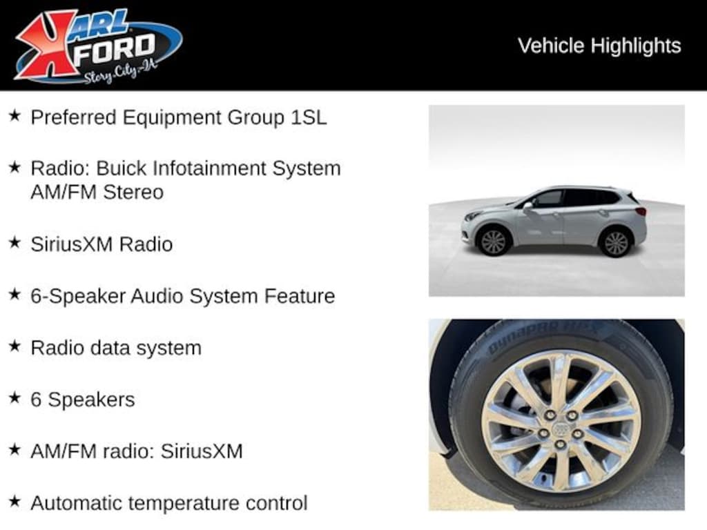 Your Dealer for Life, Karl Ford of Story City. When you buy a new car at Karl Ford of Story City you know you're finding a vehicle you can rely on. We have a great selection of new vehicles for you to test drive around Ames and Des Moines, IA. We also pride ourselves in creating a friendly atmosphere and reliable new car dealership that you can trust. Call us with any questions about our 2020 Buick Envision and our experts will be glad to help you! (515) 733-4364. *Equipment and options are generated by a 3rd party vendor, exact vehicle options may vary. Please see a salesperson for complete details and vehicle information.