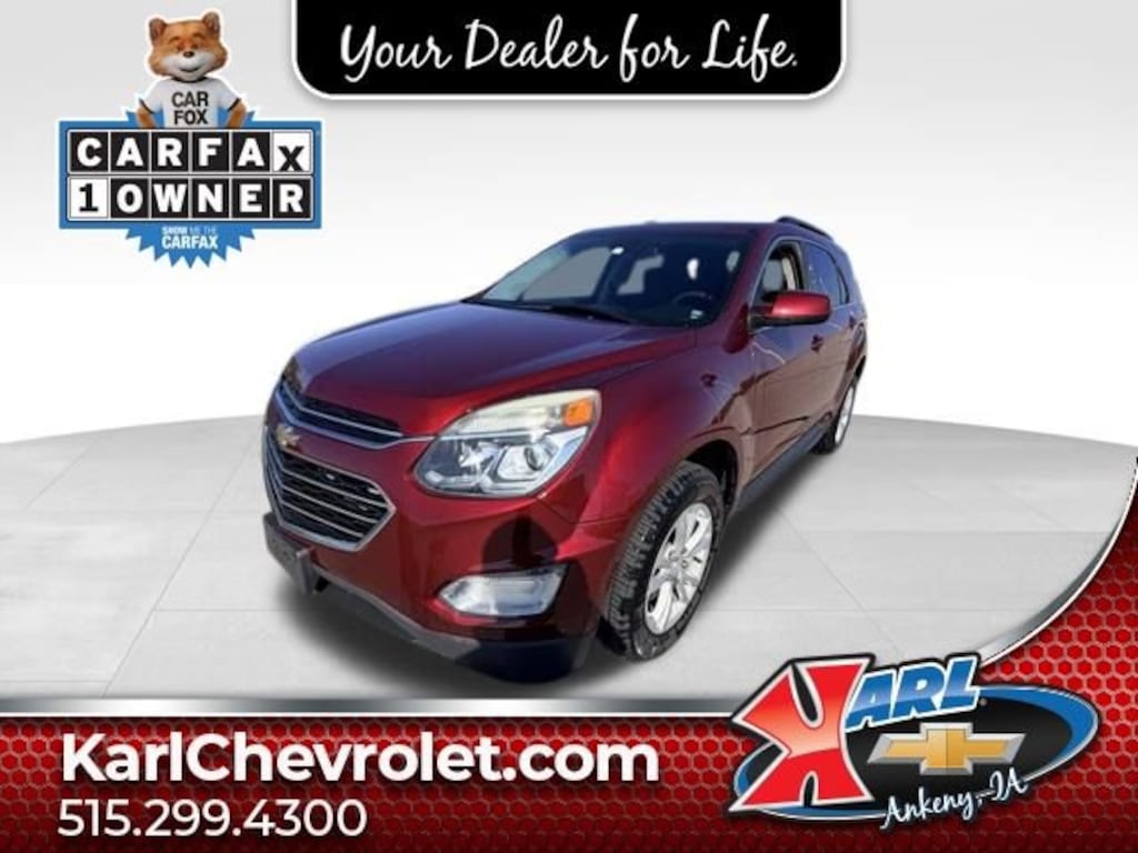 Certification Program Details: Karl Chevrolet of Ankeny, The Nation's #1 CarBravo Certified Dealer! Every CarBravo Certified vehicle includes: Comprehensive 126-Point Inspection Professionally inspected by factory-trained technicians to meet strict mechanical, safety, and cosmetic standards. 12-Month / 12,000-Mile Bumper-to-Bumper Limited Warranty Enjoy added peace of mind with extensive coverage from the day you drive off the lot. 24/7 Roadside Assistance & Courtesy Transportation Flat tire? Dead battery? Need a tow? You're covered anywhere, anytime throughout the warranty period. Vehicle History & Title Guarantee Clean title, completed safety recalls, and a full CARFAX® or AutoCheck® report provided for complete transparency. 10-Day / 500-Mile Exchange Promise If you don't absolutely love it, bring it back and exchange it no hassle, no stress. Experience peace of mind and premium protection exclusively from Karl Chevrolet of Ankeny, the Nation's #1 CarBravo Dealer!- Siren Red Tintcoat- CONVENIENCE PACKAGE- Includes (C68) automatic climate control, (BTV) remote vehicle starter system, (NP5) leather-wrapped steering wheel with audio and cruise controls, (AE8) driver 8-way power front seat adjuster and (KA1) heated driver and passenger front seats- LPO, CARGO AREA CLOSE-OUT PANEL- LIFTGATE, POWER PROGRAMMABLE REAR WITH FIXED GLASS- LICENSE PLATE BRACKET, FRONT- Radio: Chevrolet MyLink Audio System- SiriusXM Satellite Radio- Bluetooth® For Phone- Power driver seat- Exterior Parking Camera Rear- Deluxe Front Bucket SeatsThis 2017 Chevrolet Equinox LT is the perfect blend of style, comfort, and technology. With its striking Siren Red Tintcoat exterior and well-appointed interior, this Equinox is sure to turn heads wherever you go. Under the hood, you'll find a 2.4L 4-cylinder engine that delivers an impressive 31 MPG on the highway, making it both powerful and efficient.The Convenience Package takes this Equinox to the next level, adding features like automatic climate control, remote start, and a leather-wrapped steering wheel with audio and cruise controls. The power driver's seat and heated front seats ensure you'll always be comfortable, while the Chevrolet MyLink infotainment system with SiriusXM and Bluetooth connectivity keeps you connected and entertained.Safety is also a top priority, with features like the Rear Vision Camera, Electronic Stability Control, and a comprehensive airbag system. This Equinox is also a certified pre-owned vehicle, meaning it has been thoroughly inspected and comes with a 12-month/12,000-mile bumper-to-bumper warranty and 24/7 roadside assistance.Don't miss your chance to experience the perfect blend of style, technology, and value in this 2017 Chevrolet Equinox LT. Schedule a test drive today and see for yourself why this Equinox is the perfect choice for your next adventure.At Karl Chevrolet we want to help you find the best new or used car in Ankeny that suits your needs. When you buy a new car at Karl Chevrolet you know you're finding a vehicle you can rely on. We have a great selection of Platinum Quality Pre-Owned Vehicles. We also pride ourselves in creating a friendly atmosphere and a reliable Dealership that you can trust. Call us and our experts will be glad to help you! (515) 299-4300. *Equipment and options are generated by a 3rd party vendor, exact vehicle options may vary. Please see a salesperson for complete details and vehicle information.