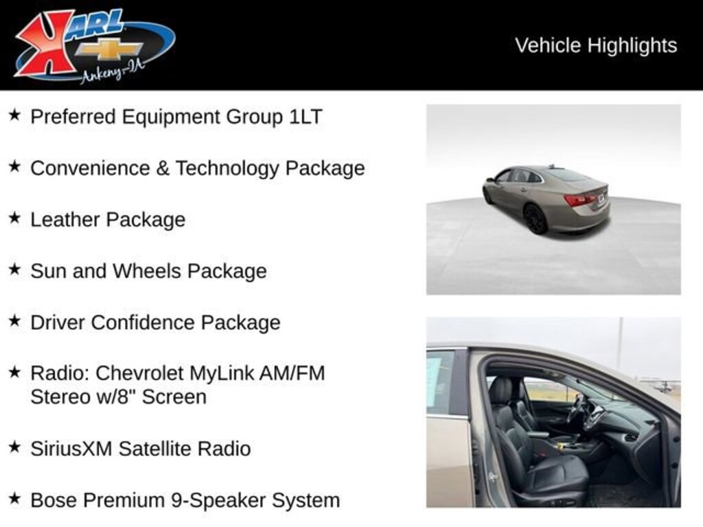 This Malibu is not just a great value, but a certified pre-owned vehicle that has been meticulously inspected and backed by an extensive warranty. Experience the peace of mind that comes with owning a Certified Pre-Owned Chevrolet from Karl Chevrolet of Ankeny, the Nation's #1 CarBravo Dealer.
