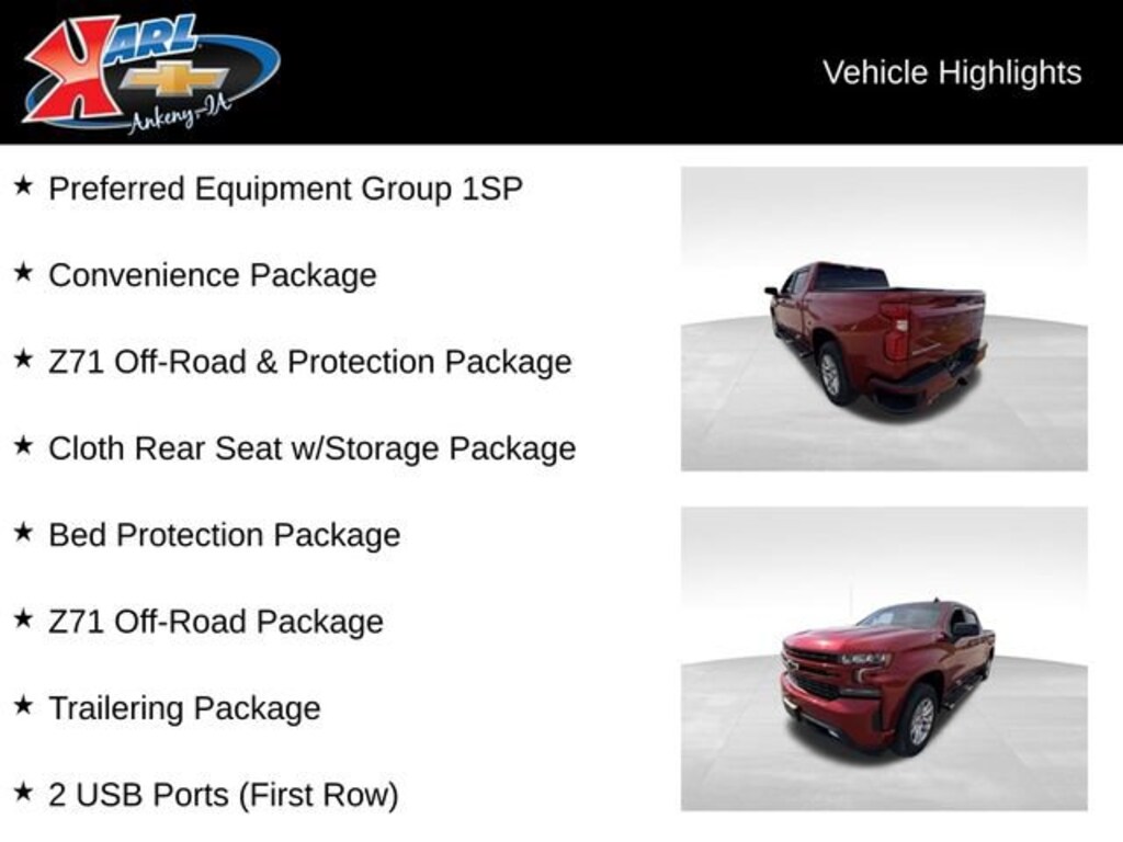 At Karl Chevrolet, we want to help you find the best new or used car in Ankeny that suits your needs. When you buy a new car at Karl Chevrolet, you know you're finding a vehicle you can rely on. We have a great selection of Platinum Quality Pre-Owned Vehicles. We also pride ourselves in creating a friendly atmosphere and a reliable Dealership that you can trust. Call us and our experts will be glad to help you! (515) 299-4300. *Equipment and options are generated by a 3rd party vendor, exact vehicle options may vary. Please see a salesperson for complete details and vehicle information.
