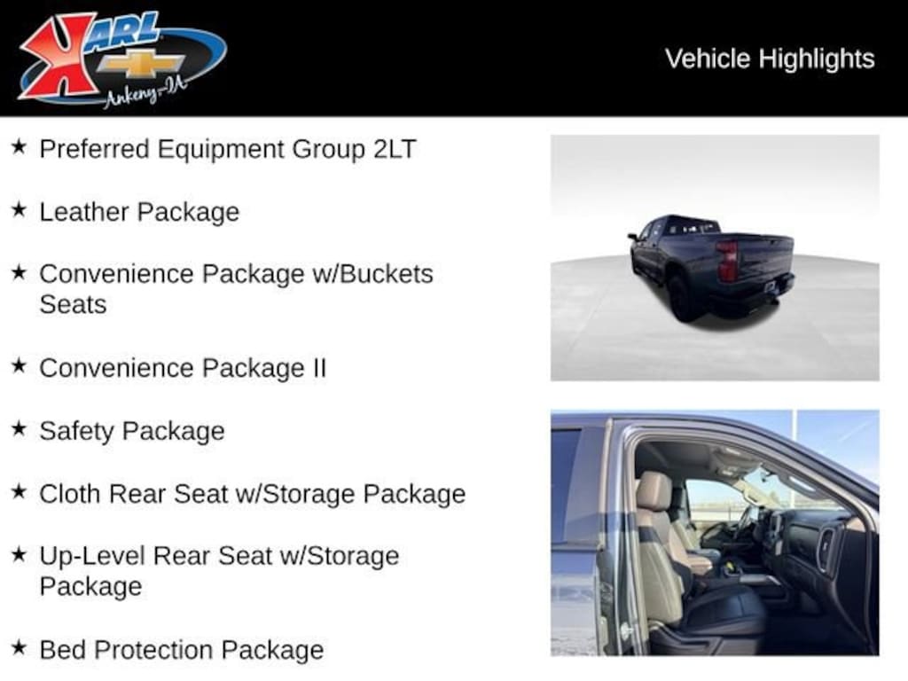Recent Arrival! Clean CARFAX. Local Trade & Sold New at Karls! Equipped With Running Boards, Mud Flaps & Tonneau Cover! Certified. Shadow Gray Metallic 2021 Chevrolet Silverado 1500 LT Trail Boss 4WD CREW CAB 147 LT EcoTec3 5.3L V8 10-Speed Automatic, 4WD, Black Leather, 10-Way Power Driver Seat w/Lumbar, 170 Amp Alternator, 2 USB Ports, 2 USB Ports (First Row), 4.2 Diagonal Color Display Driver Info Center, 4G LTE Wi-Fi Hot Spot Capable, 6-Speaker Audio System, Advanced Trailering Package, Advanced Trailering System, Apple CarPlay/Android Auto, Auto-Locking Rear Differential, Auxiliary External Transmission Oil Cooler, Bed Protection Package, Bluetooth® For Phone, Chevrolet Connected Access Capable, Chevytec Spray-On Black Bedliner, Cloth Rear Seat w/Storage Package, Color-Keyed Carpeting Floor Covering, Compass, Convenience Package II, Convenience Package w/Buckets Seats, Deep-Tinted Glass, Dual Exhaust w/Polished Outlets, Dual-Zone Automatic Climate Control, Electric Rear-Window Defogger, Electrical Lock Control Steering Column, Electronic Cruise Control, EZ Lift Power Lock & Release Tailgate, Floor Mounted Center Console, Front LED Fog Lamps, HD Radio, HD Rear Vision Camera, Heated Driver & Front Outboard Passenger Seats, Heated Steering Wheel, Heavy-Duty Air Filter, High Gloss Black Grille, High Gloss Black Mirror Caps, Hill Descent Control, Hitch Guidance w/Hitch View, Integrated Trailer Brake Controller, Keyless Open & Start, Lane Change Alert w/Side Blind Zone Alert, Leather Package, Leather Wrapped Steering Wheel, Leather-Appointed Front Seat Trim, LED Cargo Area Lighting, LED Reflector Headlamps, Manual Tilt/Telescoping Steering Column, OnStar & Chevrolet Connected Services Capable, Performance Red Recovery Hooks, Perimeter Lighting, Power Door Locks, Power driver seat, Power Sliding Rear Window w/Rear Defogger, Power windows, Preferred Equipment Group 2LT, Premium Bose 7-Speaker Sound System, Radio: Chevrolet Infotainment 3 Plus System, Rear Cross Traffic Alert, Rear Dual USB Charging-Only Ports, Rear Vision Camera, Rear Wheelhouse Liners, Remote Vehicle Starter System, Safety Package, SiriusXM Radio, SiriusXM w/360L, Standard Tailgate, Steering Wheel Audio Controls, Suspension Package, Theft Deterrent System (Unauthorized Entry), Trailering Package, Ultrasonic Front & Rear Park Assist, Universal Home Remote, Up-Level Rear Seat w/Storage Package, Wheels: 18 x 8.5 Black Painted Aluminum, Wireless Phone Projection. 16/21 City/Highway MPG 10-Speed Automatic 4WDCertification Program Details: Karl Chevrolet of Ankeny, The Nation's #1 CarBravo certified dealer, where platinum quality vehicles and unmatched benefits come together! This vehicle qualifies for our CarBravo Certified program reserved for the highest-quality pre-owned vehicles that are 10 model years or newer and have less than 100,000 miles. Every CarBravo Certified vehicle includes: ? Comprehensive 126-Point Inspection Professionally inspected by factory-trained technicians to meet strict mechanical, safety, and cosmetic standards. ? 6-Month / 6,000-Mile Bumper-to-Bumper Limited Warranty Enjoy added peace of mind with extensive coverage from the day you drive off the lot. ? 24/7 Roadside Assistance & Courtesy Transportation Flat tire? Dead battery? Need a tow? You're covered anywhere, anytime throughout the warranty period. ? Vehicle History & Title Guarantee Clean title, completed safety recalls, and a full CARFAX® or AutoCheck® report provided for complete transparency. ? 10-Day / 500-Mile Exchange Promise If you don't absolutely love it, bring it back and exchange it no hassle, no stress. Experience peace of mind and premium protection exclusively from Karl Chevrolet of Ankeny, the Nation's #1 CarBravo Certified Deale