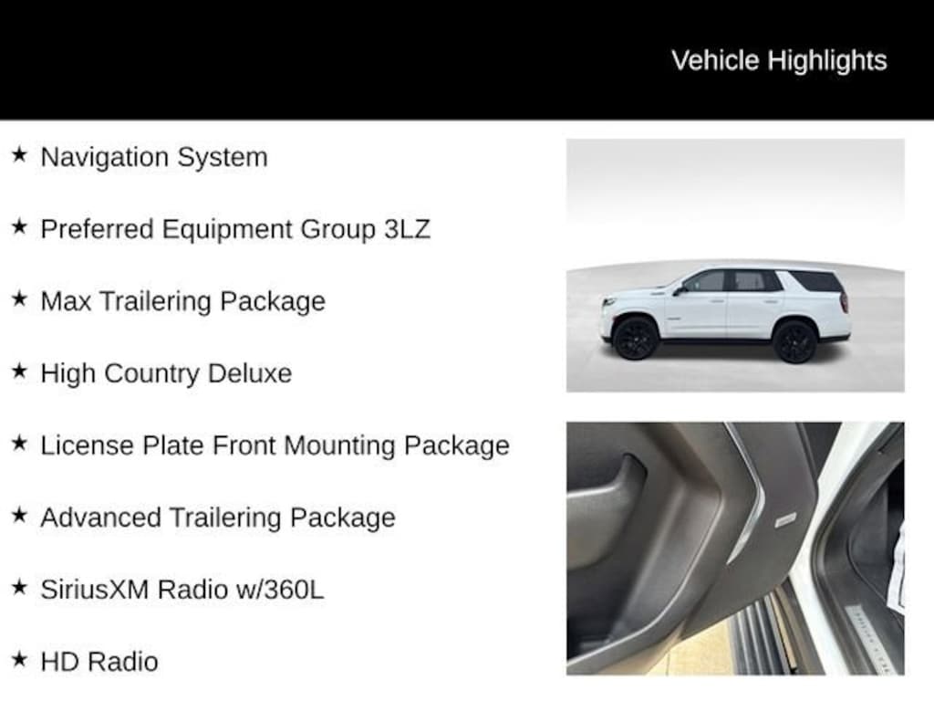 15 Diagonal Multi-Color Head-Up Display, 1st & 2nd Row Color-Keyed Carpeted Floor Mats, 2 USB Data Ports, 2-Speed Active Electronic AutoTrac Transfer Case, 3rd Row 60/40 Power-Folding Split-Bench Seat, Adaptive Cruise Control, Advanced Trailering Package, Advanced Trailering System, Air Ride Adaptive Suspension, Automatic Heated Steering Wheel, Bright Front & Rear Door Sill Plates, Chrome Door Handles w/Body-Color Strip, Color-Keyed Carpeting Floor Covering, Driver & Front Outboard Passenger Airbags, Dual Exhaust System, Dual-Pane Power Panoramic Sunroof, Enhanced Automatic Emergency Braking, Enhanced Driver Information Center, Extra Capacity Cooling System, Floor Console, Floor Console w/Storage Area, Front & Rear Park Assist, Hands-Free Rear Power Programmable Liftgate, HD Radio, HD Surround Vision, Heated 2nd Row Outboard Seats, High Country Deluxe, Hill Descent Control, Hitch Guidance w/Hitch View, Infotainment Display, Inside Rearview Auto-Dimming Rear Camera Mirror, Integrated Trailer Brake Controller, Lane Change Alert w/Side Blind Zone Alert, Lane Keep Assist w/Lane Departure Warning, Leather-Wrapped Steering Wheel, LED Daytime Running Lamps, License Plate Front Mounting Package, Max Trailering Package, Memory Settings, Navigation System, Outside Heated Power-Adjustable Mirrors, Power Release 2nd Row Bucket Seats, Power Tilt & Telescopic Steering Column, Power-Retractable Assist Steps, Preferred Equipment Group 3LZ, Rear Camera Mirror Washer, Rear Cross Traffic Alert, Rear Pedestrian Alert, Remote Start, Safety Alert Seat, SiriusXM NavTraffic, SiriusXM Radio w/360L, Trailer Side Blind Zone Alert, Universal Home Remote.