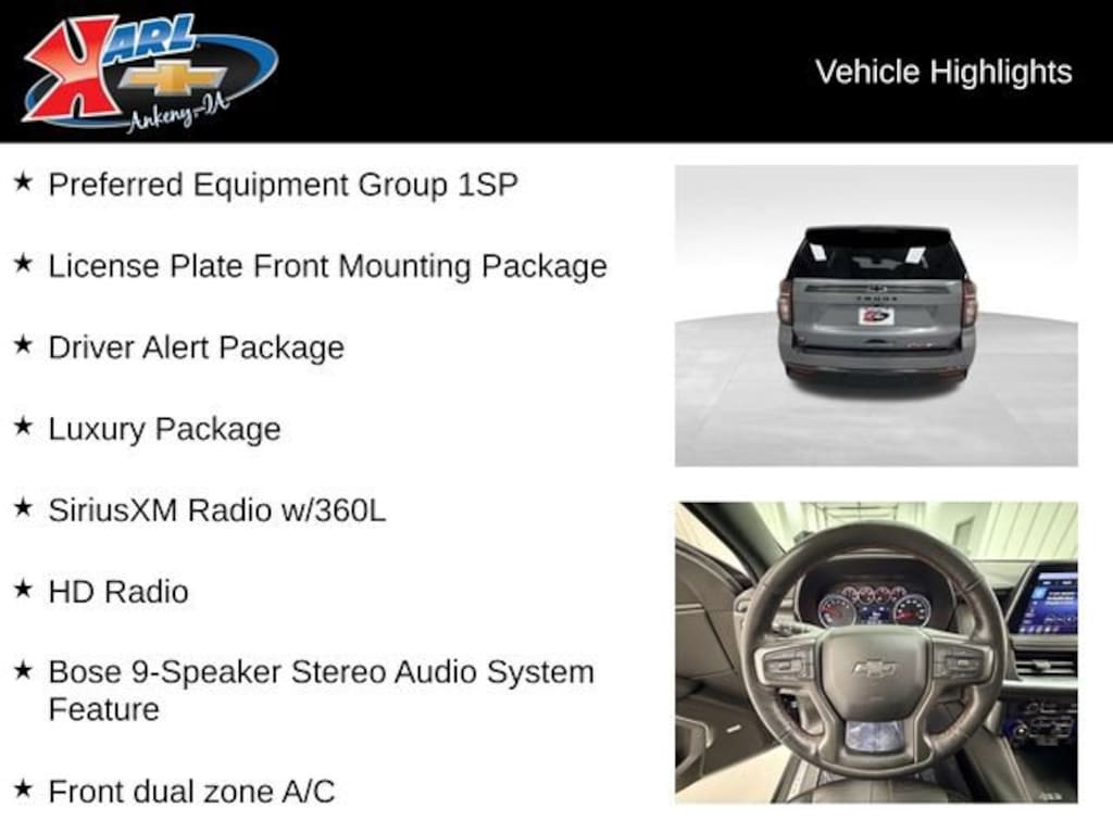 Certification Program Details: Karl Chevrolet of Ankeny, The Nation's #1 CarBravo Certified Dealer! Every CarBravo Certified vehicle includes: Comprehensive 126-Point Inspection Professionally inspected by factory-trained technicians to meet strict mechanical, safety, and cosmetic standards. 12-Month / 12,000-Mile Bumper-to-Bumper Limited Warranty Enjoy added peace of mind with extensive coverage from the day you drive off the lot. 24/7 Roadside Assistance & Courtesy Transportation Flat tire? Dead battery? Need a tow? You're covered anywhere, anytime throughout the warranty period. Vehicle History & Title Guarantee Clean title, completed safety recalls, and a full CARFAX® or AutoCheck® report provided for complete transparency. 10-Day / 500-Mile Exchange Promise If you don't absolutely love it, bring it back and exchange it no hassle, no stress. Experience peace of mind and premium protection exclusively from Karl Chevrolet of Ankeny, the Nation's #1 CarBravo Dealer!- Luxury Package- Sunroof, Power Panoramic, Dual-Pane, Tilt-Sliding- Bose 9-Speaker Stereo Audio System Feature- HD Radio- SiriusXM Radio w/360L- Front dual zone A/C- Rear air conditioning- Hands-Free Rear Power Programmable Liftgate- Power driver seat- Remote Start- Universal Home Remote- Automatic Heated Steering Wheel- Front & Rear Park Assist- Auto High-beam Headlights- LED Daytime Running LampsThis 2021 Chevrolet Tahoe RST 4WD 4DR RST is an exceptional choice for those seeking a spacious, versatile, and well-equipped SUV. With its striking Gray exterior and a host of premium features, this Tahoe is ready to elevate your driving experience.Under the hood, you'll find the powerful EcoTec3 5.3L V8 engine, mated to a smooth-shifting 10-Speed Automatic transmission with Overdrive. This combination delivers a confident and responsive performance, whether you're navigating city streets or exploring the open road.Step inside, and you'll be greeted by a beautifully appointed interior that offers seating for up to eight passengers. The Luxury Package adds a wealth of luxurious touches, including a power panoramic sunroof, heated front and second-row seats, a heated steering wheel, and a premium Bose audio system.Safety and technology are also at the forefront, with features like front and rear park assist, auto high-beam headlights, and a suite of advanced driver-assistance systems. The Chevrolet Infotainment 3 Plus system with SiriusXM and wireless Apple CarPlay/Android Auto integration keeps you connected and entertained on every journey.This Tahoe RST is a true standout in the full-size SUV segment, offering a winning combination of style, capability, and premium amenities. If you're in the market for a vehicle that can handle your daily needs and weekend adventures with ease, we encourage you to come in and experience this exceptional Chevrolet Tahoe for yourself.At Karl Chevrolet we want to help you find the best new or used car in Ankeny that suits your needs. When you buy a new car at Karl Chevrolet you know you're finding a vehicle you can rely on. We have a great selection of Platinum Quality Pre-Owned Vehicles. We also pride ourselves in creating a friendly atmosphere and a reliable Dealership that you can trust. Call us and our experts will be glad to help you! (515) 299-4300. *Equipment and options are generated by a 3rd party vendor, exact vehicle options may vary. Please see a salesperson for complete details and vehicle information.