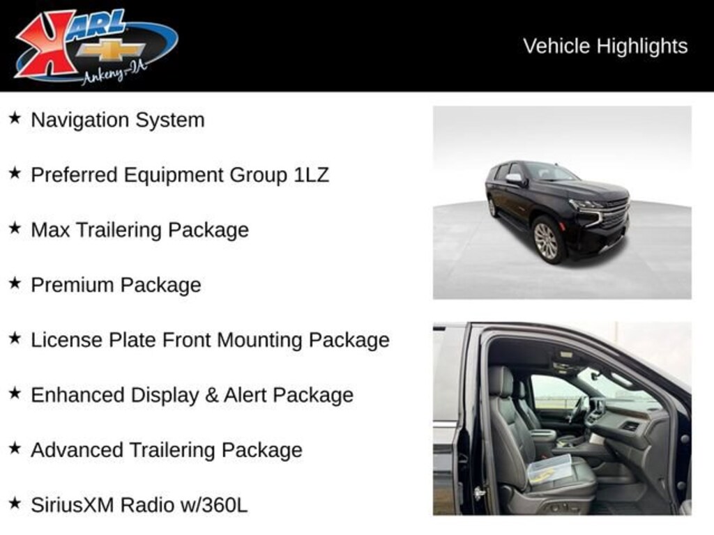 Certification Program Details: Karl Chevrolet of Ankeny, The Nation's #1 CarBravo Certified Dealer! Every CarBravo Certified vehicle includes: Comprehensive 126-Point Inspection Professionally inspected by factory-trained technicians to meet strict mechanical, safety, and cosmetic standards. 12-Month / 12,000-Mile Bumper-to-Bumper Limited Warranty Enjoy added peace of mind with extensive coverage from the day you drive off the lot. 24/7 Roadside Assistance & Courtesy Transportation Flat tire? Dead battery? Need a tow? You're covered anywhere, anytime throughout the warranty period. Vehicle History & Title Guarantee Clean title, completed safety recalls, and a full CARFAX® or AutoCheck® report provided for complete transparency. 10-Day / 500-Mile Exchange Promise If you don't absolutely love it, bring it back and exchange it no hassle, no stress. Experience peace of mind and premium protection exclusively from Karl Chevrolet of Ankeny, the Nation's #1 CarBravo Dealer! Premium Package Wheels, 22 x 9 Polished Aluminum Advanced Trailering Package Enhanced Display & Alert Package Max Trailering Package Preferred Equipment Group 1LZThis 2021 Chevrolet Tahoe Premier 4WD 4DR PREMIER is a remarkable SUV that combines exceptional capability, advanced technology, and premium comfort. With its powerful EcoTec3 5.3L V8 engine and 4-wheel drive system, this Tahoe is ready to take on any adventure, whether it's towing your boat, hauling your gear, or navigating rough terrain.Inside, you'll find a wealth of premium features that elevate the driving experience. The Bose 10-speaker audio system and SiriusXM Radio with 360L provide exceptional sound quality, while the dual-pane power panoramic sunroof and heated and ventilated front seats offer unparalleled comfort. The Hands-Free Rear Power Programmable Liftgate and 15 Diagonal Multi-Color Head-Up Display add convenience and sophistication to your daily drives.Safety is also a top priority, with advanced driver assistance technologies like Adaptive Cruise Control, Enhanced Automatic Emergency Braking, and Lane Keep Assist with Lane Departure Warning. The Trailer Side Blind Zone Alert and Hitch Guidance with Hitch View make towing a breeze, giving you the confidence to tackle any task.This Tahoe Premier is not just a capable SUV it's a true luxury vehicle. With its sleek black exterior and premium interior, it's sure to turn heads wherever you go. And with the added peace of mind of the CarBravo Certified program, you can drive with confidence knowing that this vehicle has been thoroughly inspected and backed by an extensive warranty.At Karl Chevrolet, we are committed to providing our customers with the best possible experience. Our team of experts is ready to help you find the perfect vehicle to fit your lifestyle and budget. Call us today at (515) 299-4300 to schedule a test drive and experience the exceptional quality of this 2021 Chevrolet Tahoe Premier 4WD 4DR PREMIER.At Karl Chevrolet we want to help you find the best new or used car in Ankeny that suits your needs. When you buy a new car at Karl Chevrolet you know you're finding a vehicle you can rely on. We have a great selection of Platinum Quality Pre-Owned Vehicles. We also pride ourselves in creating a friendly atmosphere and a reliable Dealership that you can trust. Call us and our experts will be glad to help you! (515) 299-4300. *Equipment and options are generated by a 3rd party vendor, exact vehicle options may vary. Please see a salesperson for complete details and vehicle information.