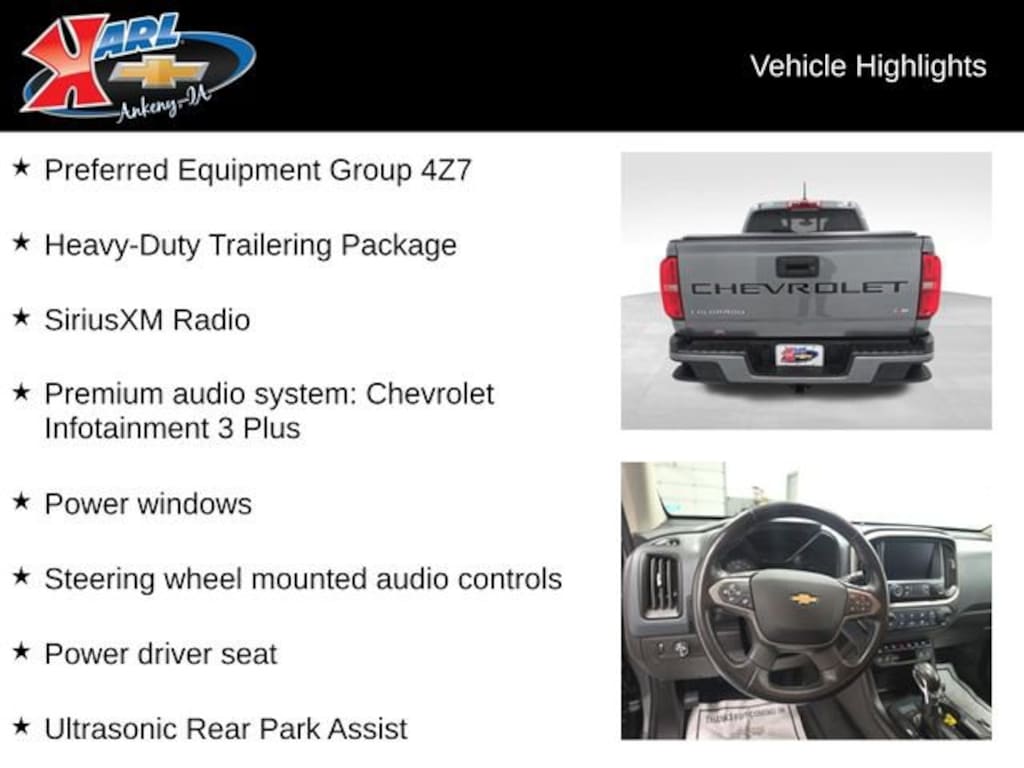 At Karl Chevrolet we want to help you find the best new or used car in Ankeny that suits your needs. Check out the 2022 Chevrolet Colorado For Sale in Ankeny, IA. When you buy a new car at Karl Chevrolet you know you're finding a vehicle you can rely on. We have a great selection of Platinum Quality Pre-Owned Vehicles. We also pride ourselves in creating a friendly atmosphere and reliable new car dealership that you can trust. Call us with any questions about our 2022 Chevrolet Colorado and our experts will be glad to help you! (515) 299-4300. *Equipment and options are generated by a 3rd party vendor, exact vehicle options may vary. Please see a salesperson for complete details and vehicle information.
